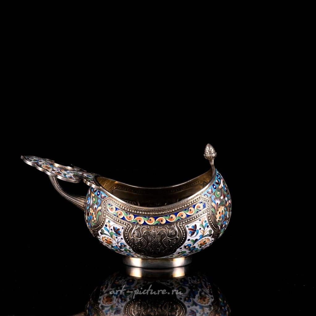 Ковш из золотого серебра и смальти клоизоне. Изысканное украшение в виде листовидных завитков, установленных полудрагоценными камнями. Русское производство начала XX века. Размеры: 10,5 x 19,5 x 11,5 см. Вес: 465 г.
