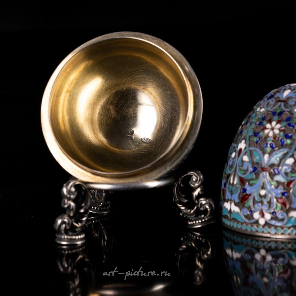 Серебро-золочение и эмаль клоизоне Яйцо с изысканным узором листьев Русское производство начала XX века, высота 10 см, вес 170 г.