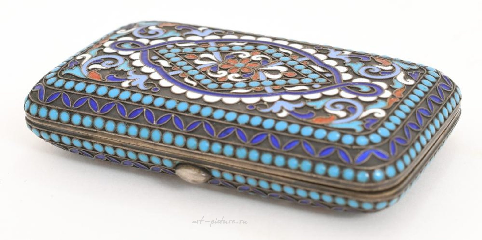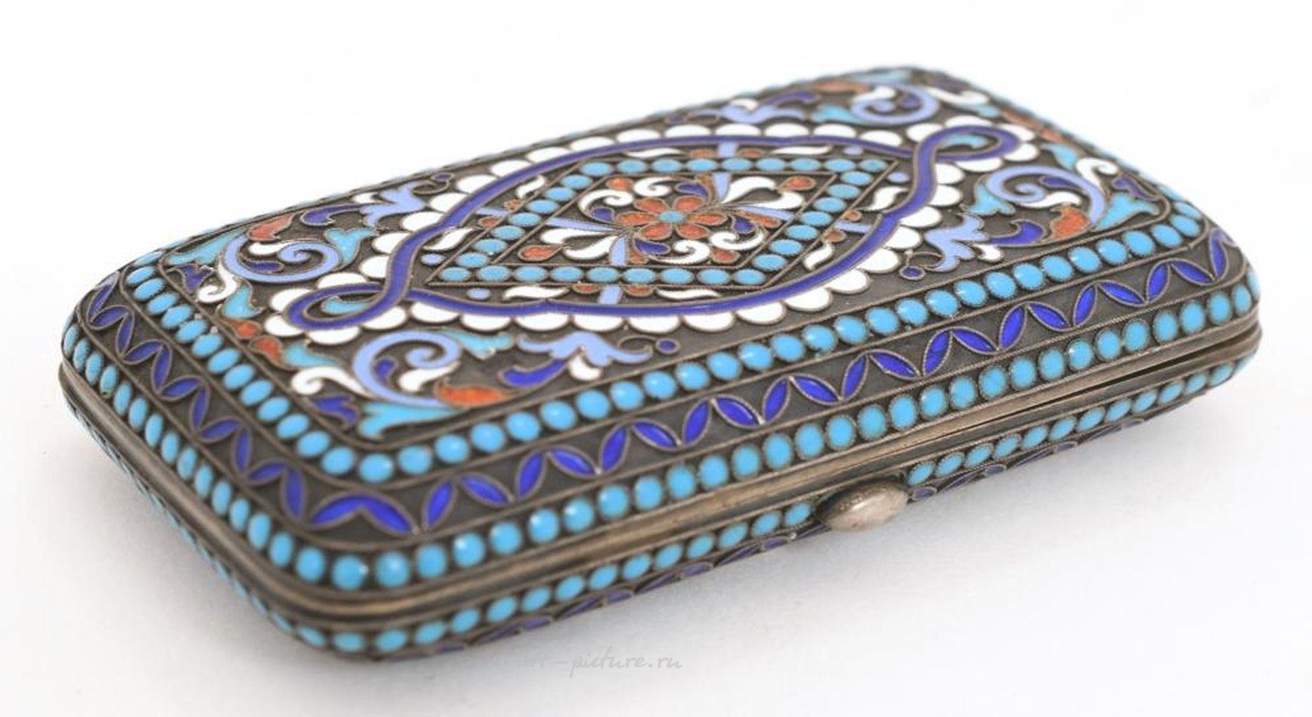 Серебряный и эмалевый сигаретный кейс русского производства Густава Клингерта, конец 19 века, отмеченный клеймами, размером 3/4 x 3 1/2 x 2 дюйма.