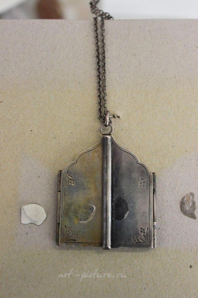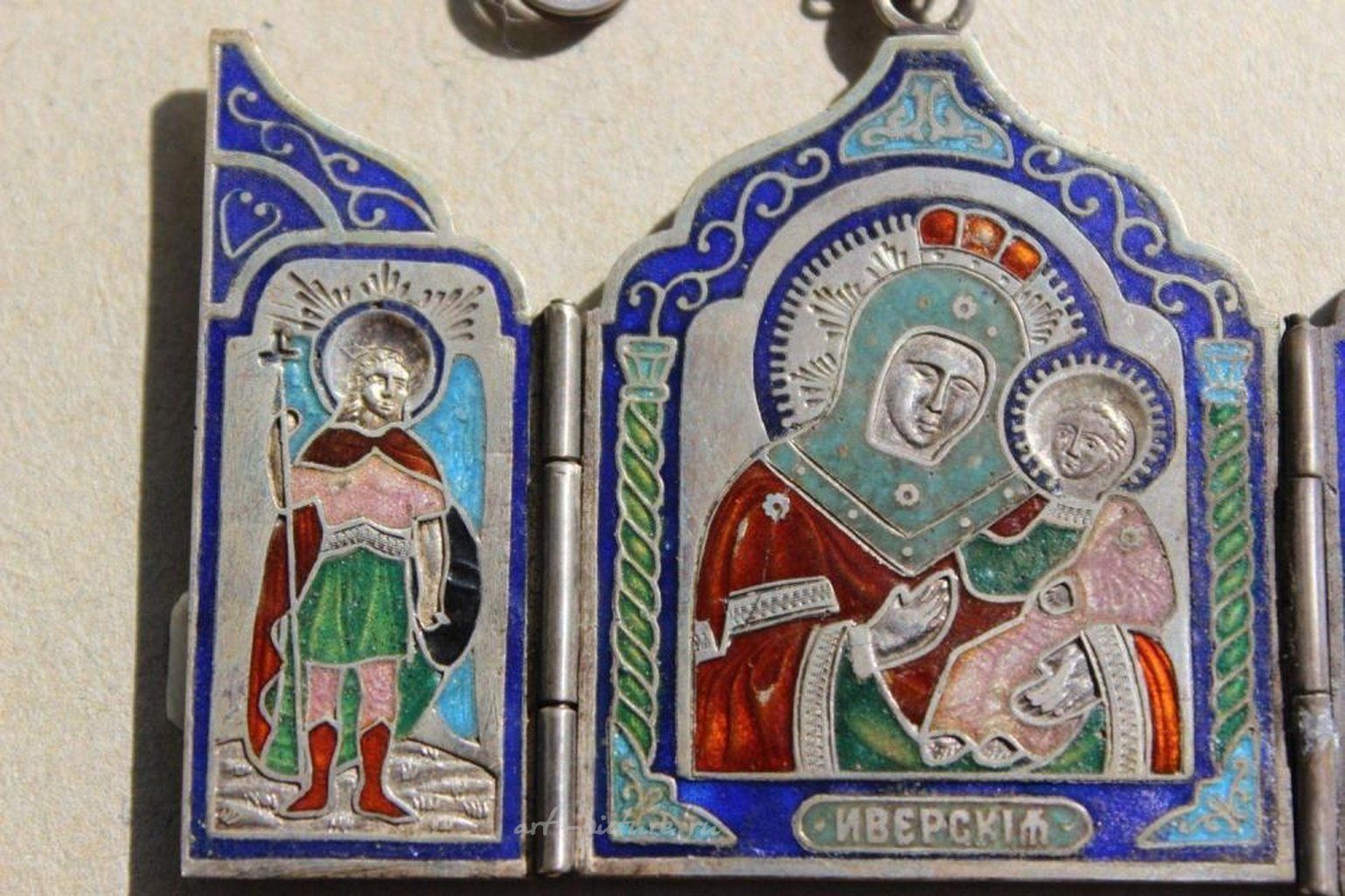 Иконостас Карла Фаберже с эмалированными серебряными панелями, изображающими Иверскую Божью Матерь, Императорская Россия. На четырех печатях: 1. Двуглавый орел (Российская империя), 2. Карл Фаберже, 3. 84 проба = процент серебра; 4. Святой Георгий Победоносец, что означает - сделано в Москве. Ширина в полностью открытом положении: 73 мм; Ширина в закрытом положении: 37 мм; Высота: [недостающая информация].