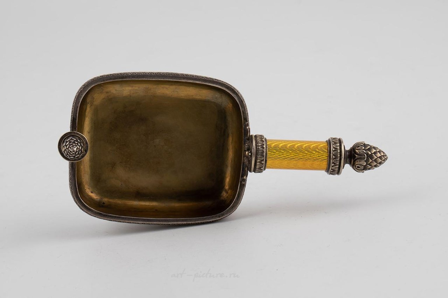 Гильошированная эмаль Ковш с двуглавым орлом 2-я пол. 20 в. Серебро, внутри позолоченное. Ручка украшена прозрачной эмалью на желтом фоне. Конические окончания ручки. Нанесенные двуглавый орел и царская корона. Псевдо-русские маркировки. Длина 12,5 см, вес 108 г.