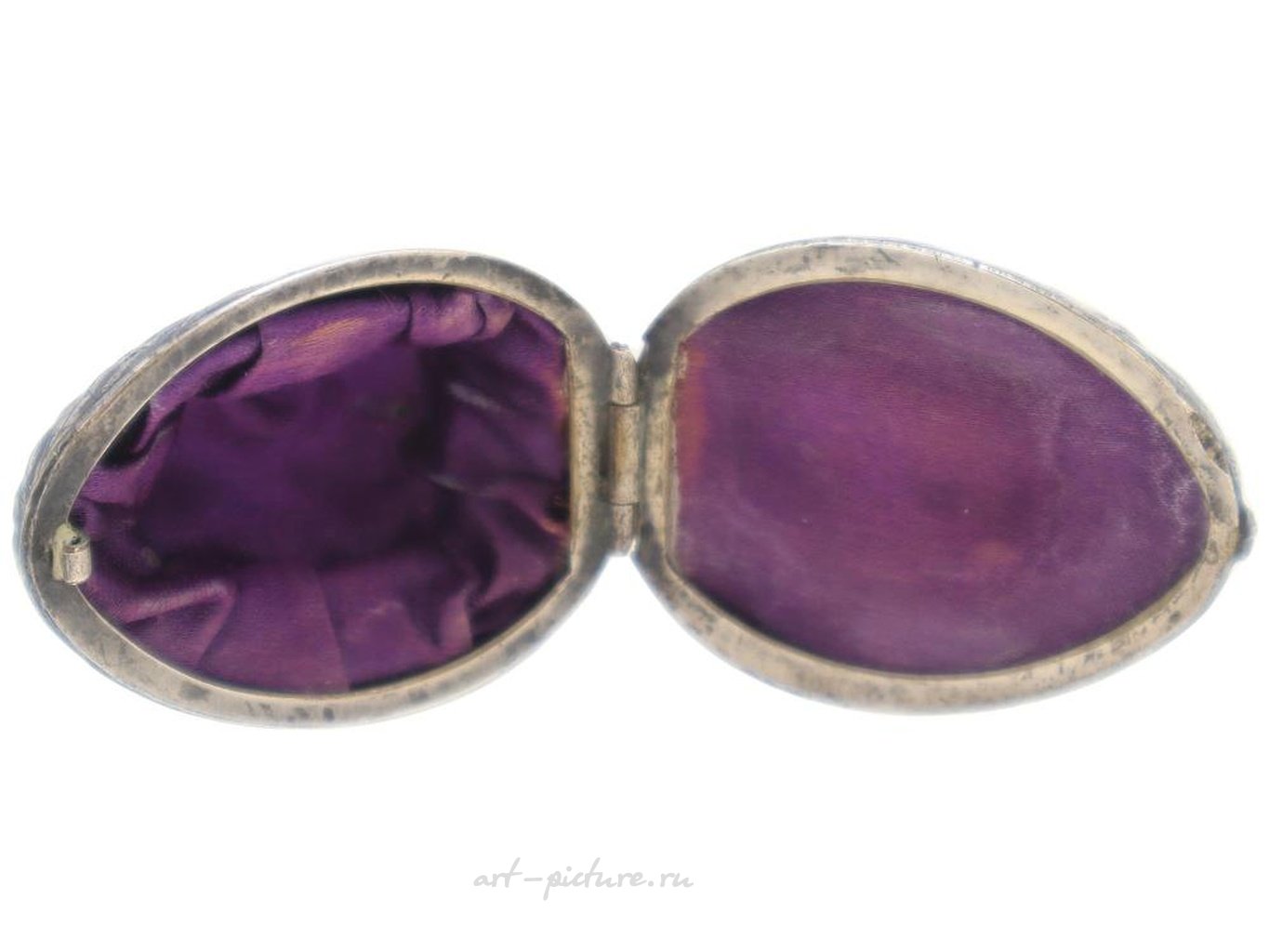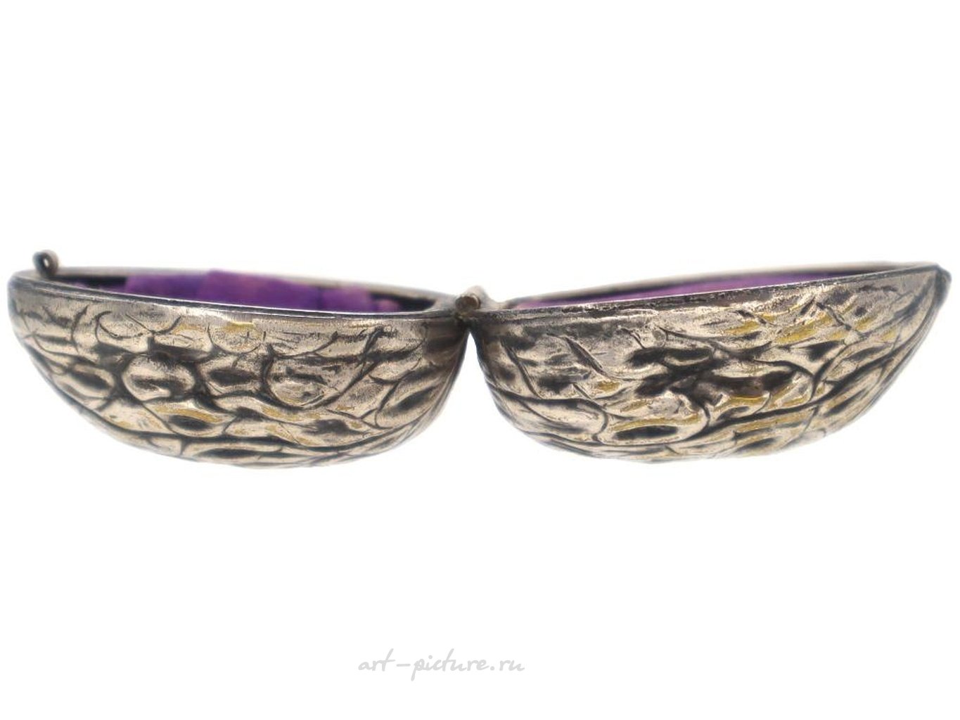 Винтажный русский серебряный позолоченный скульптурный ящик или футляр. Ящик выполнен в дизайне из орехового дерева, гравированный с детальными узорами. Внутри фиолетовая подкладка. Без маркировки. Около середины до конца 20-го века. Винтажные и современные фигурные ящики, футляры, предметы туалетного столика, аксессуары и коллекционные предметы.