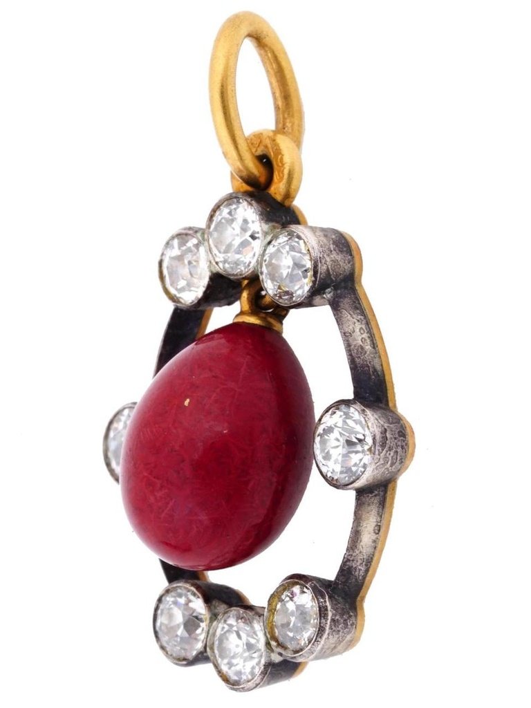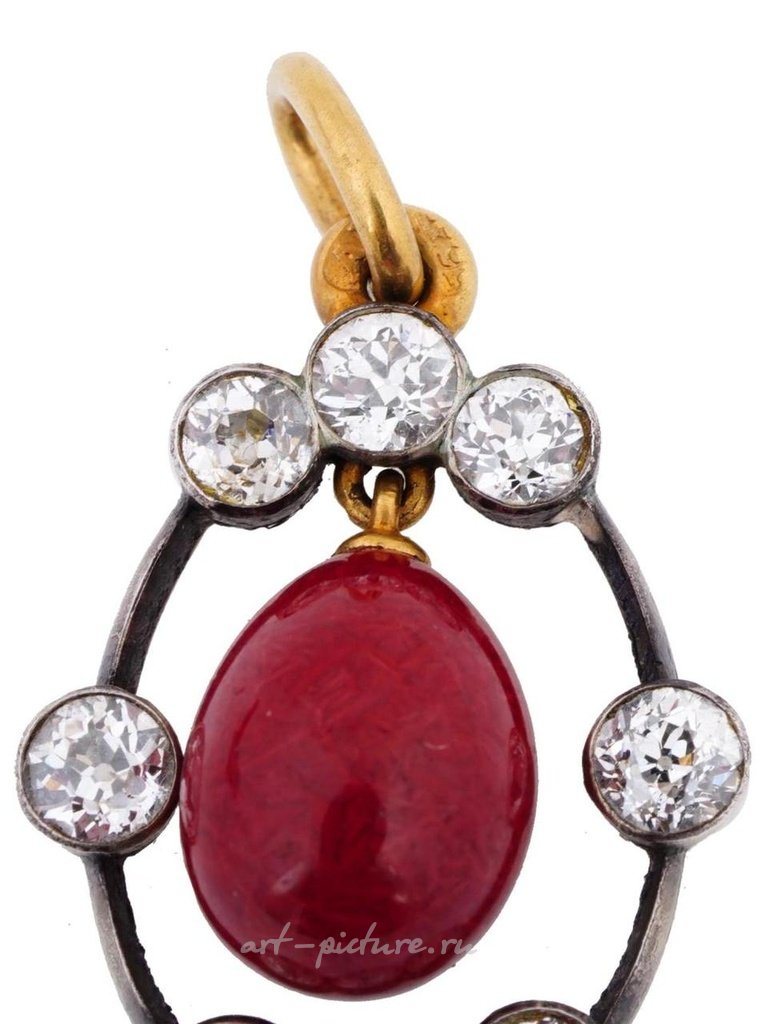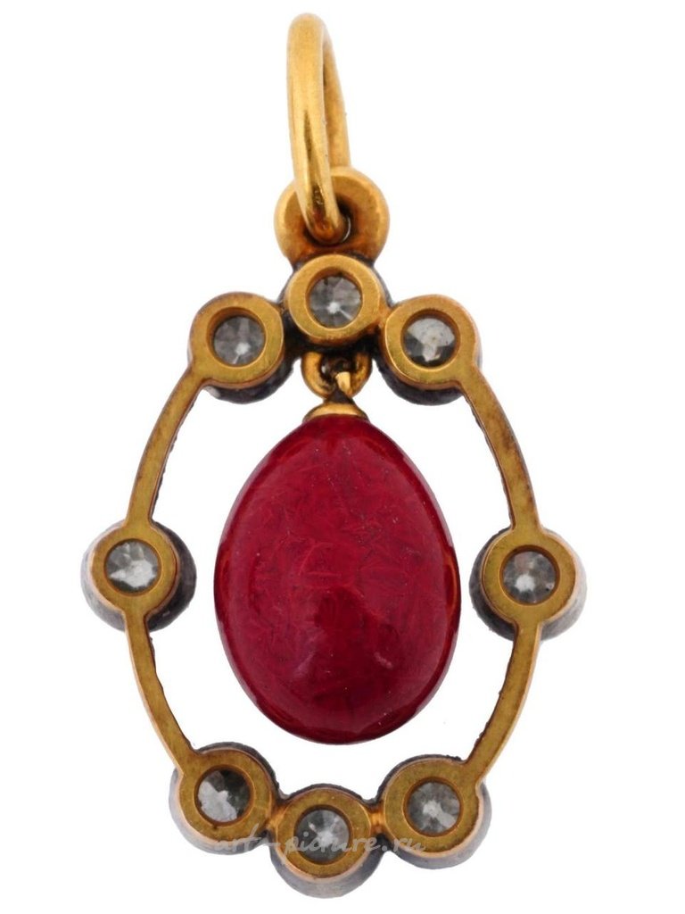 Подвеска русской формы в виде яйца, украшенная пурпуриновым камнем, украшенным восемью бриллиантами, вставленными в серебряные и золотые основания. С золотым кольцом подвески, отмеченным русским пробирным знаком и марками производителя. В футляре. Общий вес: 4 г. Русские подвески с драгоценными камнями и ювелирные изделия.