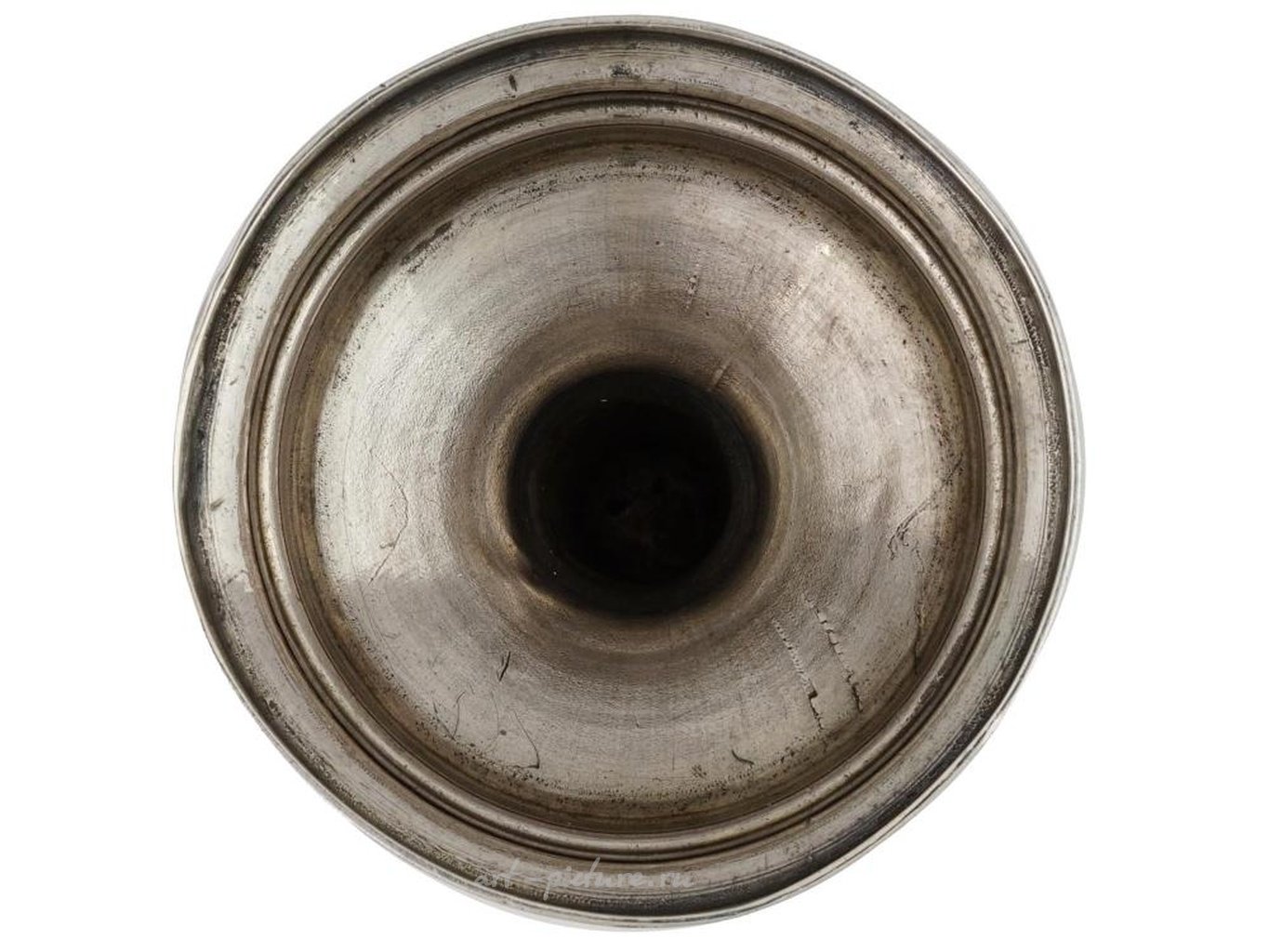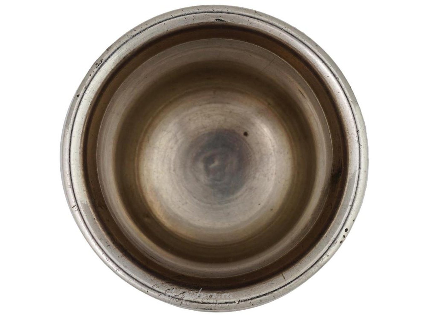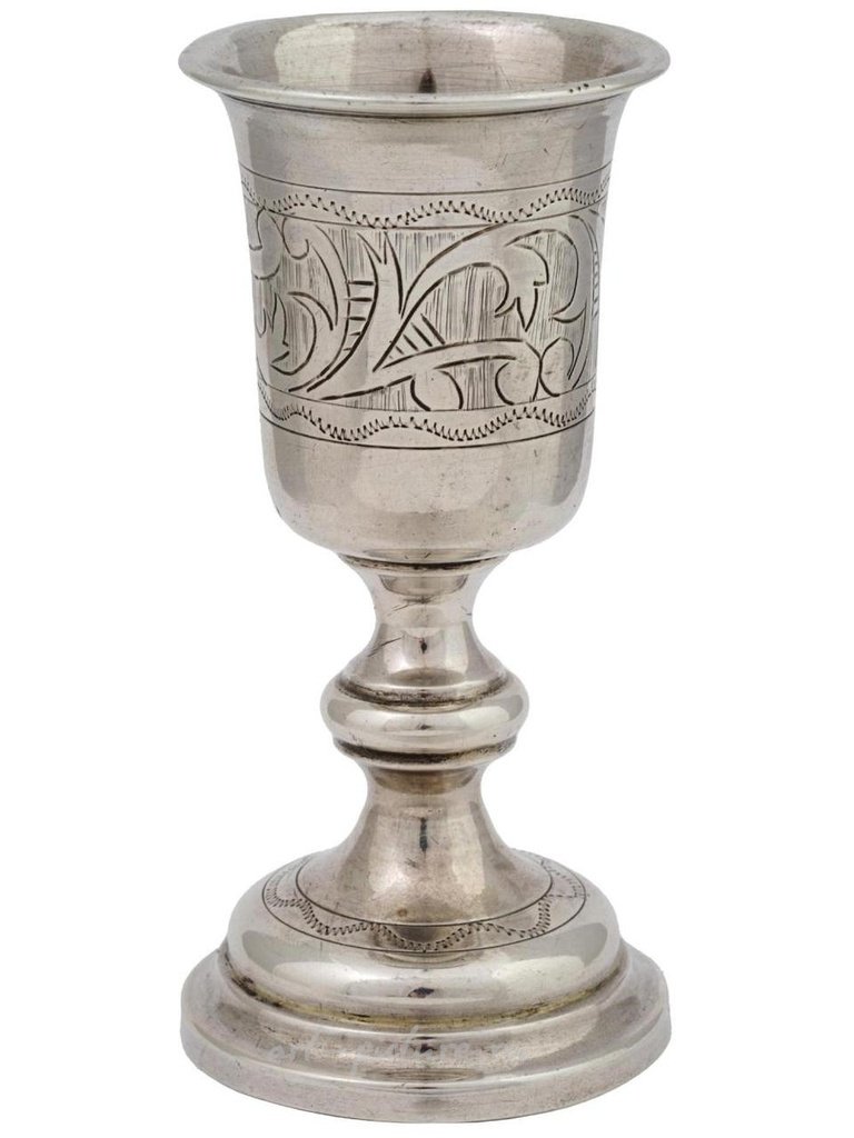 Русская серебряная кидушная чаша. Чаша на ножке украшена гравированными цветочными орнаментами. Маркировка стандарта серебра 84, марка изготовителя находятся на основании. Вес: 67 грамм. Коллекционные предметы юдаики, русская серебряная посуда, столовые принадлежности и религиозные предметы.