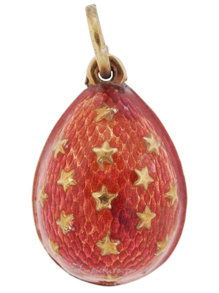 Русская серебряная подвеска в форме яйца с эмалевым покрытием и позолотой. Подвеска имеет красную эмалевую поверхность с декоративными золочеными звездами. Марка 84-й пробы серебра и марка производителя находятся на кольце подвески. Вес: 6 грамм. Русские ювелирные изделия, серебряные изделия и коллекционные предметы.