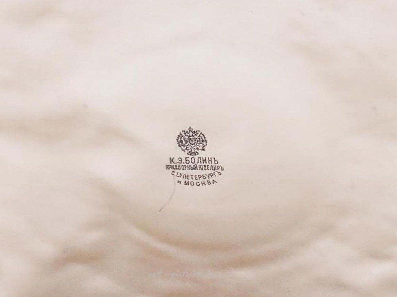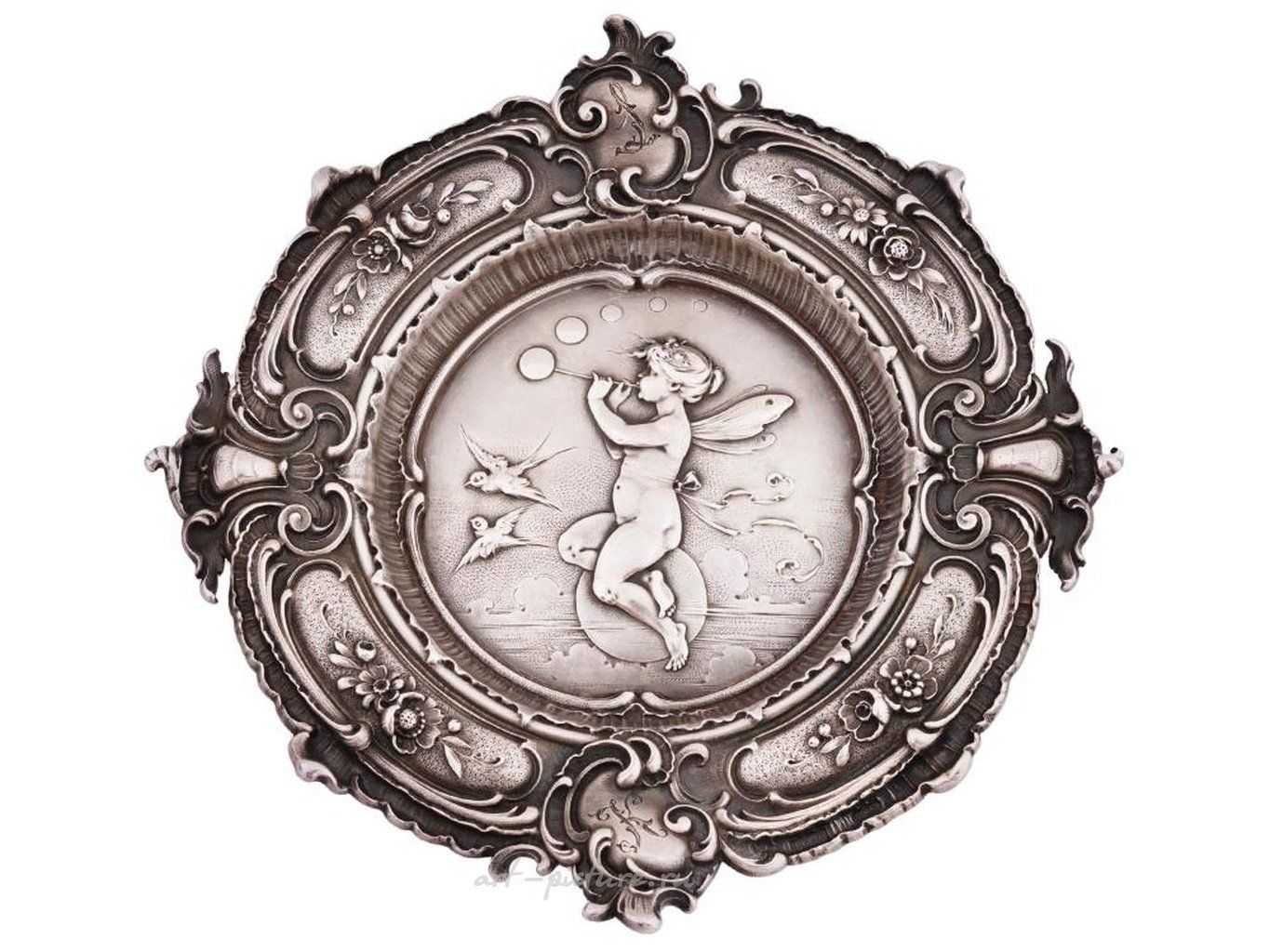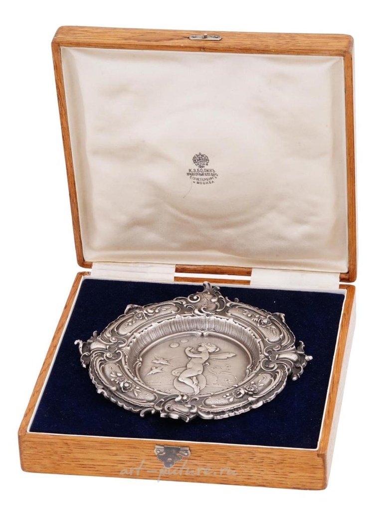 Антикварная русская серебряная пепельница, продаваемая Болиным в Санкт-Петербурге, с изысканными рельефными узорами. В центре изображен парящий купидон, выпускающий пузыри, рядом с парой ласточек. Край украшен богатыми рокайлями и свернутыми буквами "С", дополненными картушами с веточками цветов. Отмечено клеймом с пробирным знаком "ПТ" и маркой 84. Поставляется в футляре. Происхождение: Shapiro Auctions LLC, 31 июля 2021 года.