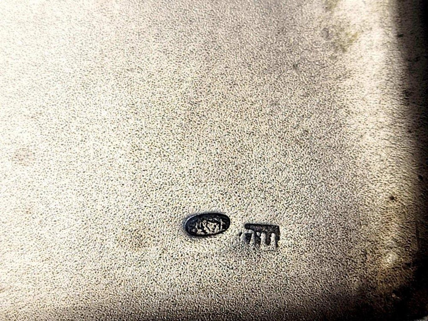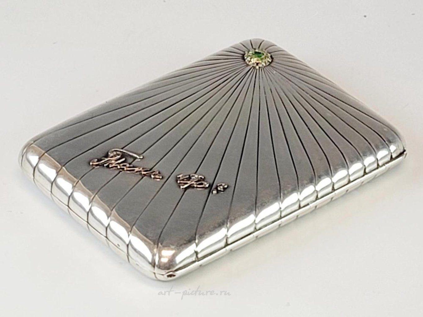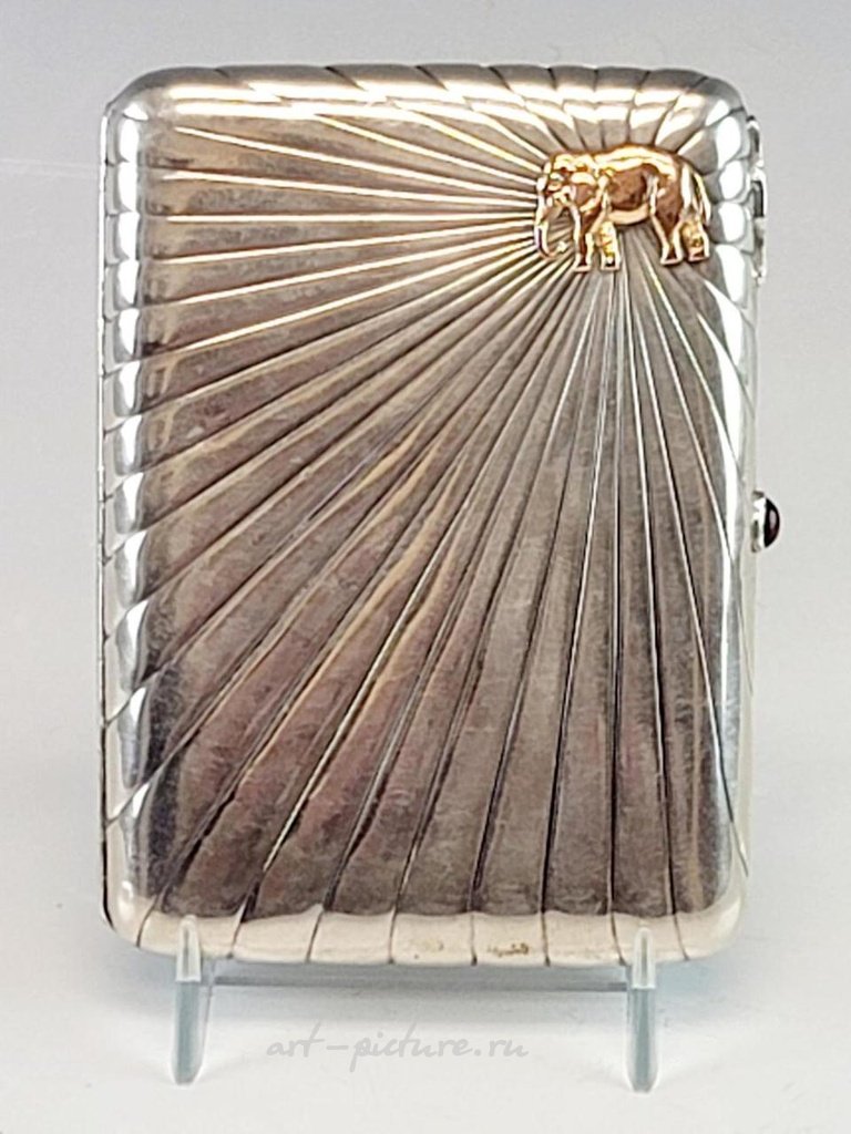 Антикварный русский серебряный сигаретный чехол, украшенный полудрагоценным камнем и золотыми наложениями, изображающими фигуру слона и надписи на кириллице. Красная каменная кнопка. Помечен внутри маркой 84 русского императорского серебра и другими русскими клеймами. Около: конец 19-го или начало 20-го века. Антикварные русские изделия из серебра, аксессуары для табака для коллекционеров. Вес 162 г.