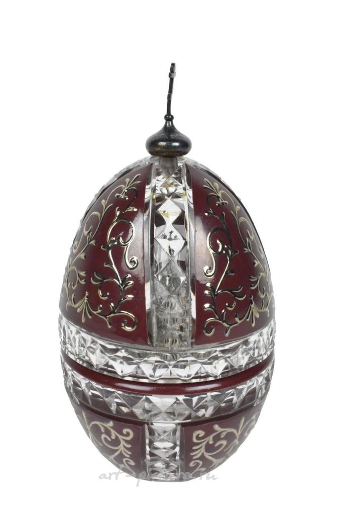 Ограниченное издание Кристального и Серебряного яйца Святого Владимира от Theo. Faberge. Кристальное яйцо украшено бордовой эмалью с изысканными серебряными узорами, завершающимися вермильским куполом, из которого поднимается серебряный православный крест. Яйцо открывается, раскрывая масштабную реконструкцию Собора Святого Владимира из стерлингового серебра. На нижней стороне имеется клеймо и подпись с серийным номером 445. Изготовлено в Англии, в рамках издания из 500 экземпляров. Примечание: Собор Святого Владимира находится на месте, где