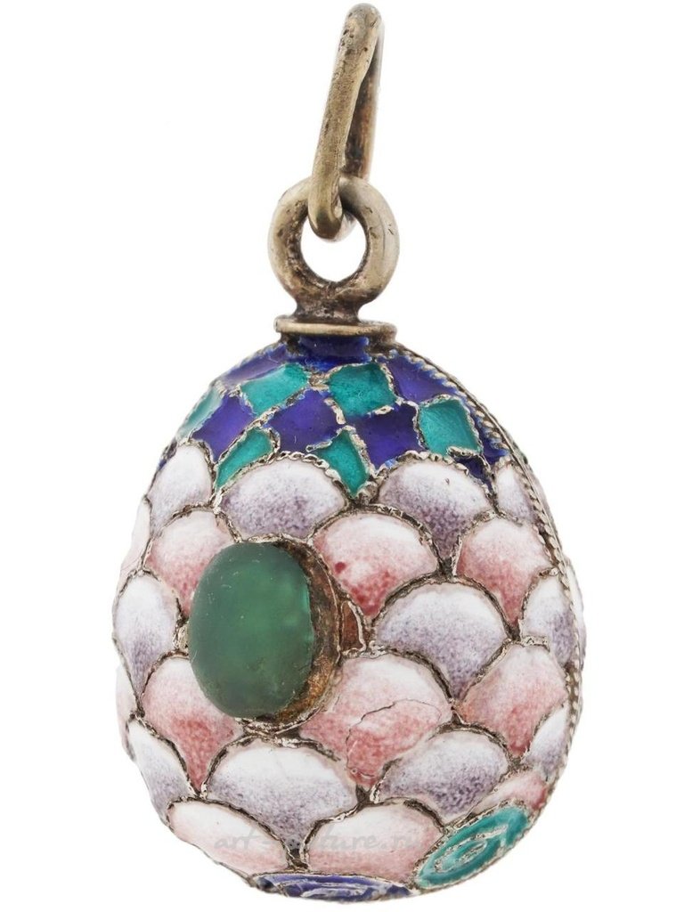 Русская подвеска в форме яйца из золоченого серебра с эмалевым покрытием. Шарм имеет поверхность клоизонне эмали, сочетающую в себе мотив чешуек рыбы и геометрические орнаменты. Овальные зеленые кабошоны из драгоценных камней украшают изделие с обеих сторон. Подвесное кольцо имеет клеймо 88 серебряного стандарта и марку производителя. Вес: 7 грамм. Русская ювелирная продукция, серебряные изделия и коллекционные предметы.