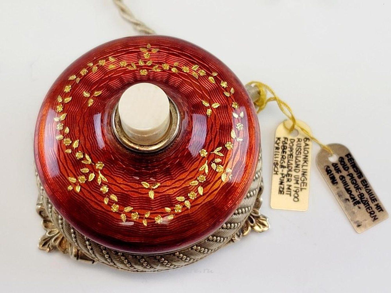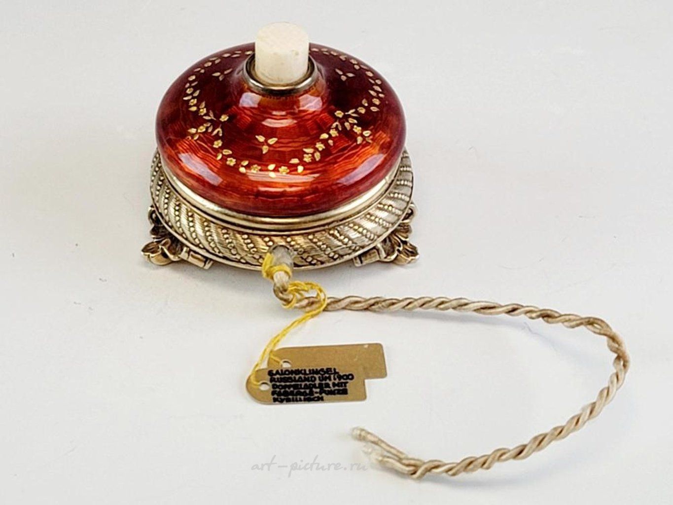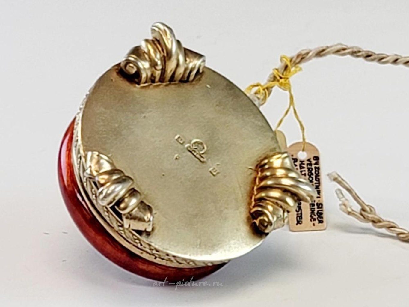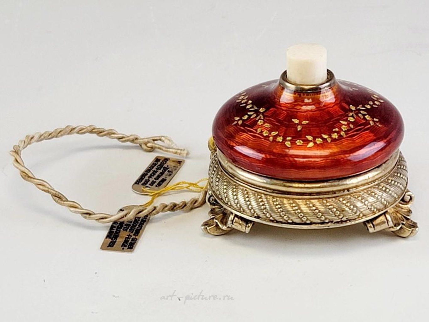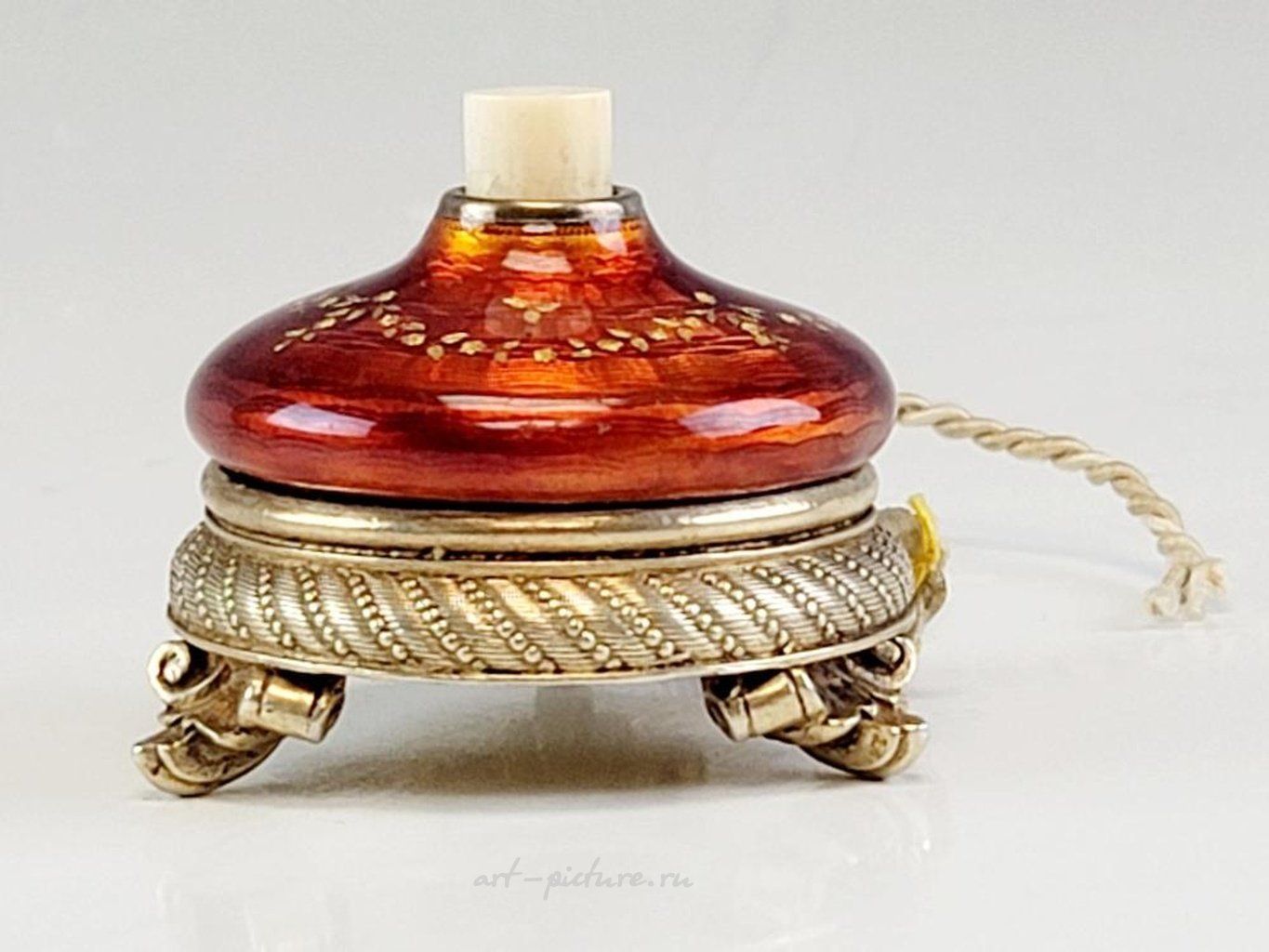 Серебряная русская лампада с эмалью на карельской березеКруглая основа из золоченого серебра с гравированными узорами стоит на трех свернутых листьями ножках. Верхняя часть покрыта глубокой вишнево-красной эмалью на волнистом гильошированном фоне с украшениями из золотых цветочных гирлянд. Под маркой на обратной стороне с 84 русским имперским серебряным стандартом, инициалами производителя БА и другими русскими марками. Около 1900 года. Русское серебряное эмальное декоративное искусство, антиквариат и коллекционирование.