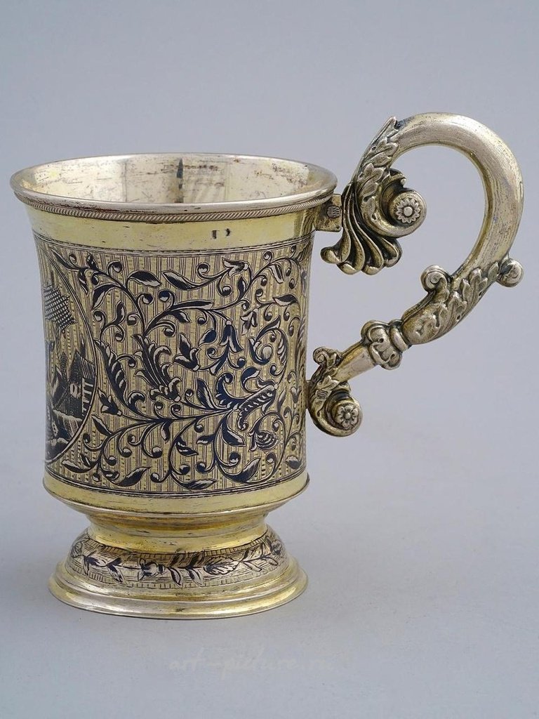 Россия, 1883 год. Русская серебряная чашка с золочением, ниеллированная круглым изображением всадника в сельской местности с фолиевыми орнаментами, скроллируемая ручка, украшенная листьями акации и цветами. Маркировка: нечитаемая марка производителя, русский серебряный стандарт 84, 1883 год. Вес: 230 грамм (8.1 унции).