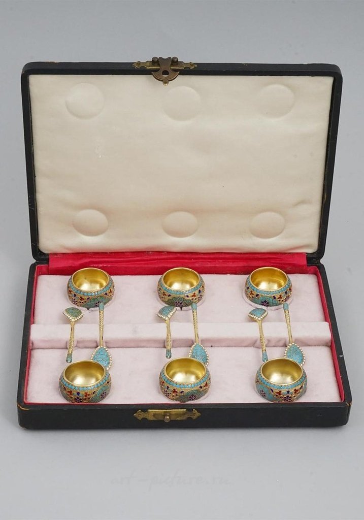 Густав Клингерт, Москва, 1882-1899 гг. Русский серебряный золоченый и эмалированный набор солонок, состоящий из шести солонок и шести сервировочных ложек. Солонки украшены цветочным эмалированным орнаментом в технике клоизонне и установлены на трех шаровых ножках. Каждая деталь помечена: 84 русский серебряный стандарт, московская марка города, "ГК".