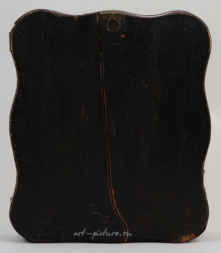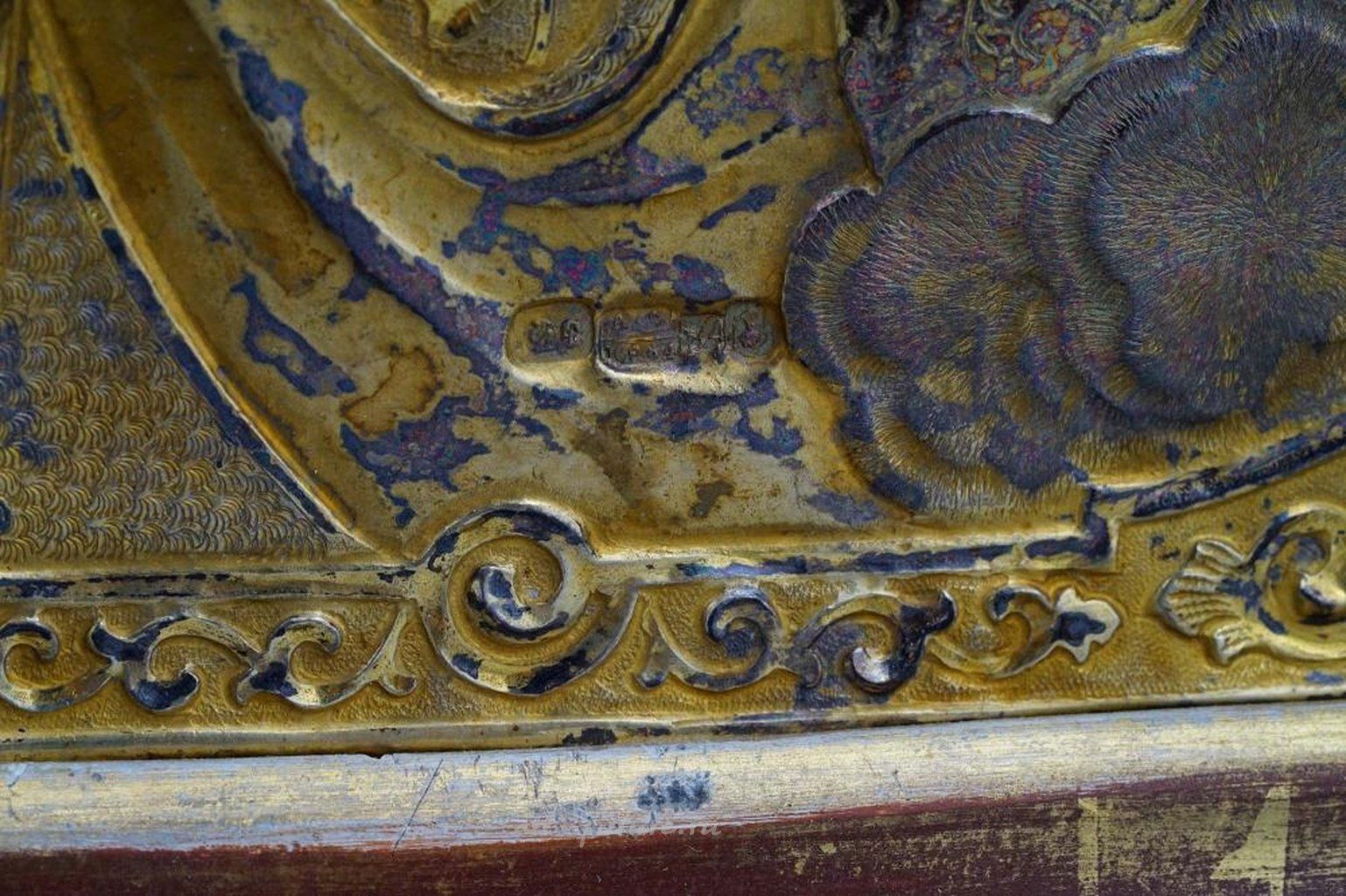Православная икона, изображающая Иисуса Христа-Пантократора, покрытого серебряно-золотым ризой с резьбой и репуассе на деревянном киоте. Печати: марка производителя "ФС" на кириллице, пробирная марка "АС" под датой 1864 года, стандарт серебра 84, марка города Москвы. Москва, 1864 год.