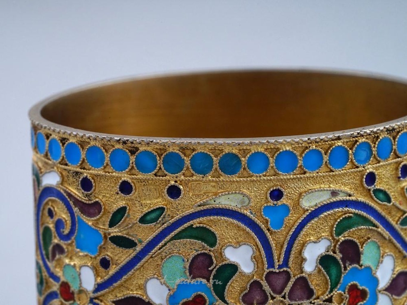 Густав Клингерт, Москва, около 1900-х годов. Два серебряных позолоченных и эмалированных кольца для салфеток конца 19 века. Первое украшено различными цветами эмали в виде завитков листвы и цветочных узоров с золочеными медальонами на голубом эмалированном фоне. Второе украшено стилизованными полихромными эмалированными цветочными и листовыми мотивами на золоченом фоне с голубыми границами из пеллет. Оба изделия имеют клейма с русской маркировкой 84.