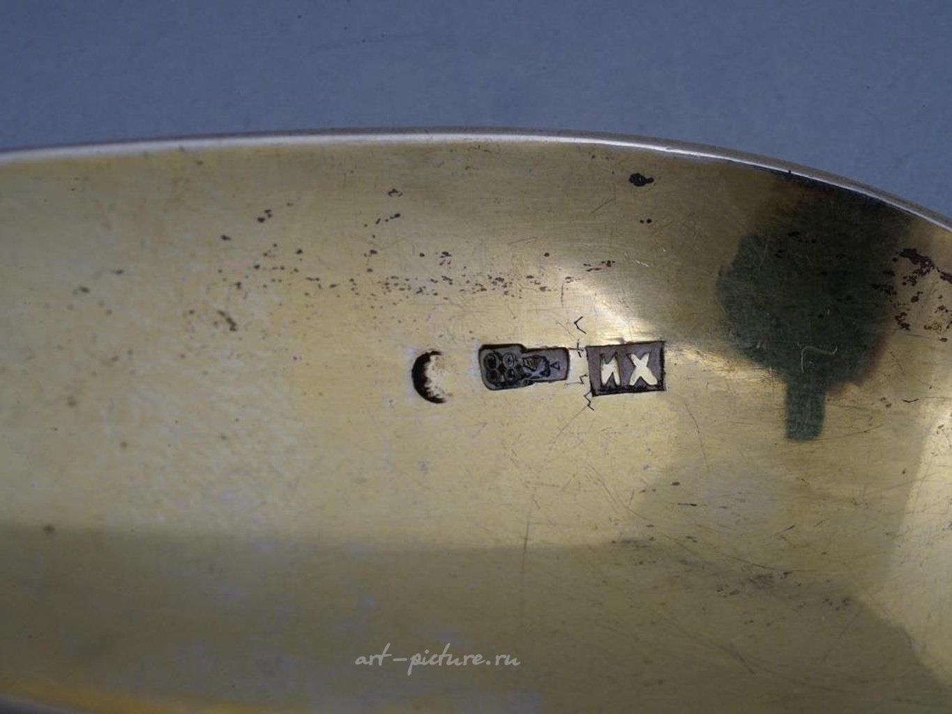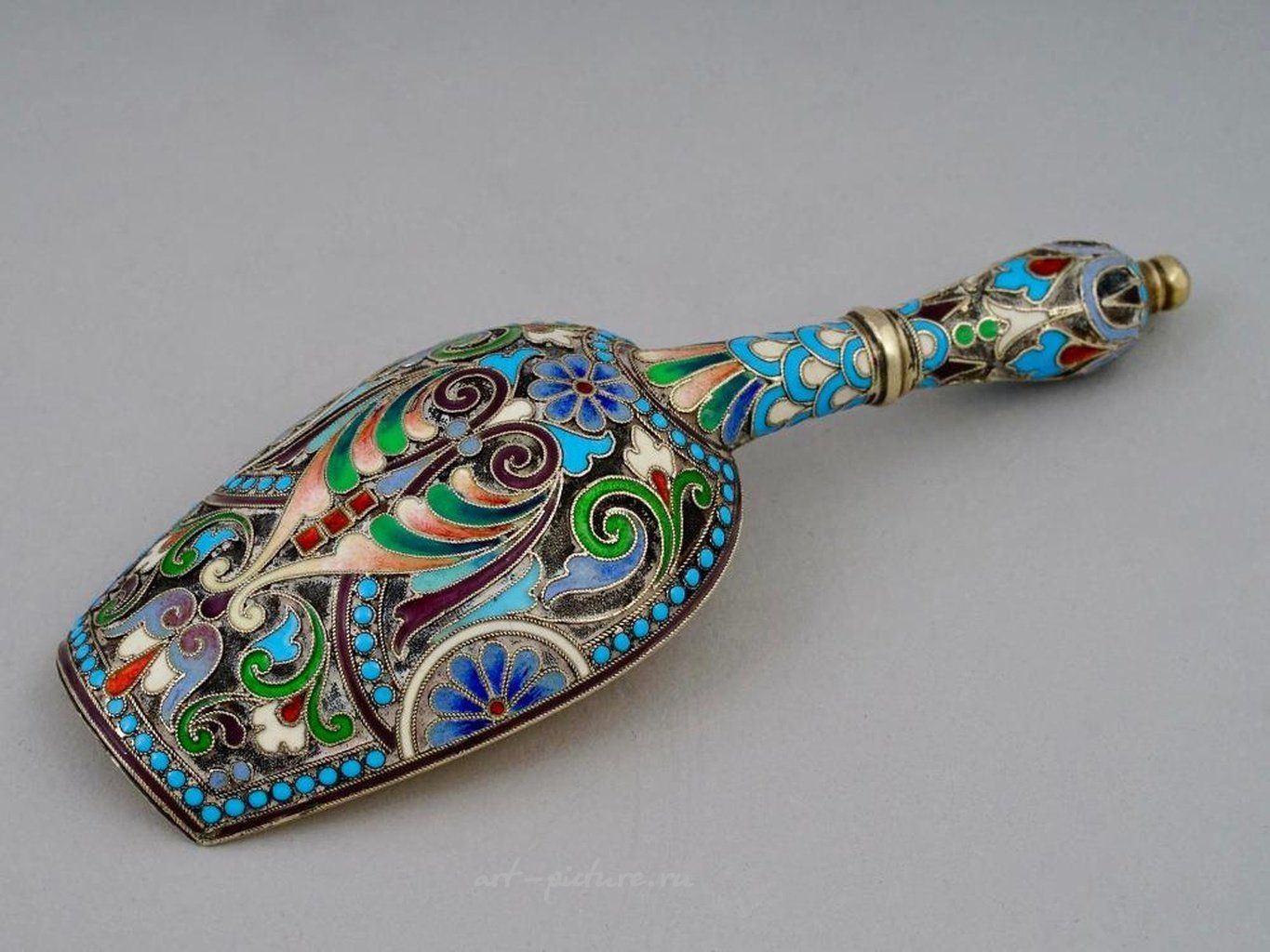 Иван Хлебников, Москва, русская серебряная ложка для сахара с позолотой, украшенная эмалевой росписью в технике клоизоне с цветочным орнаментом в оттенках кобальтового синего, зеленого, красного и фиолетового с турецкими эмалевыми вкраплениями. Внутренняя часть ложки позолочена. Маркировка: стандарт серебра 88, марка мастера 'ИХ' на кириллице для Ивана Хлебникова.