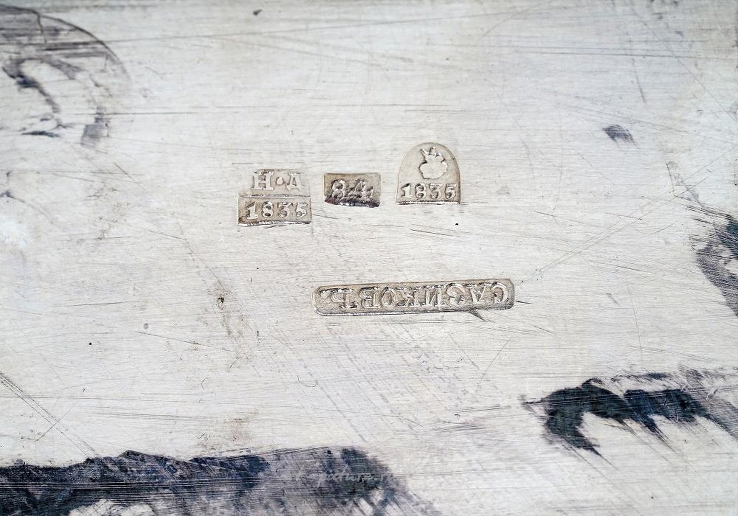 Прекрасный русский сервиз для чая и кофе из серебра от Сазикова. Включает в себя серебряный чайник, серебряный кофейник, серебряный креманку, серебряный сахарный бокал с крышкой и квадратную миску. Все пять предметов украшены тонко выточенным декоративным узором. Маркировка: 'САЗИКОВ' на кириллице, пробирный клеймо 'Н.Д.' на кириллице над 1835 годом, стандарт серебра 84 и другие русские клейма. Около 183