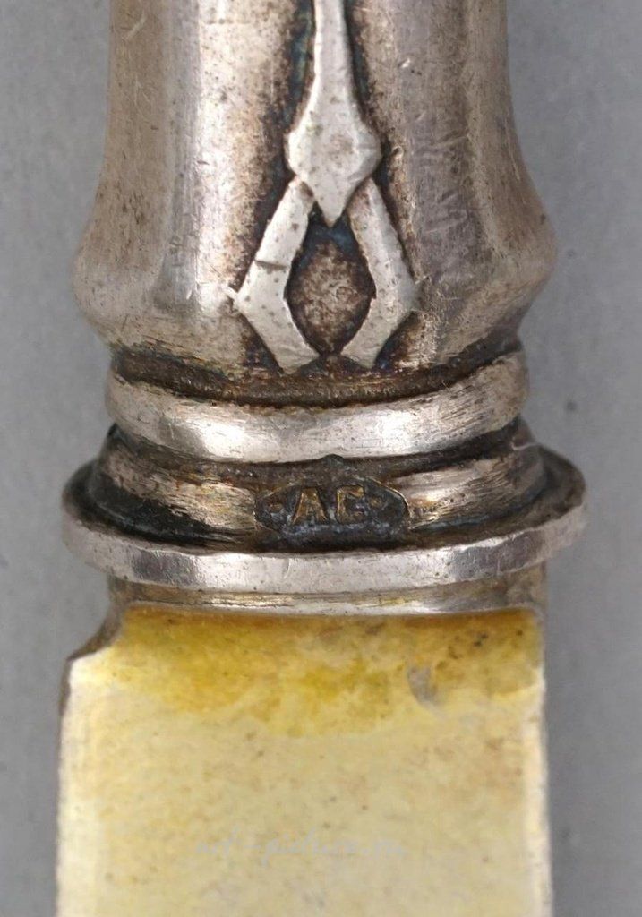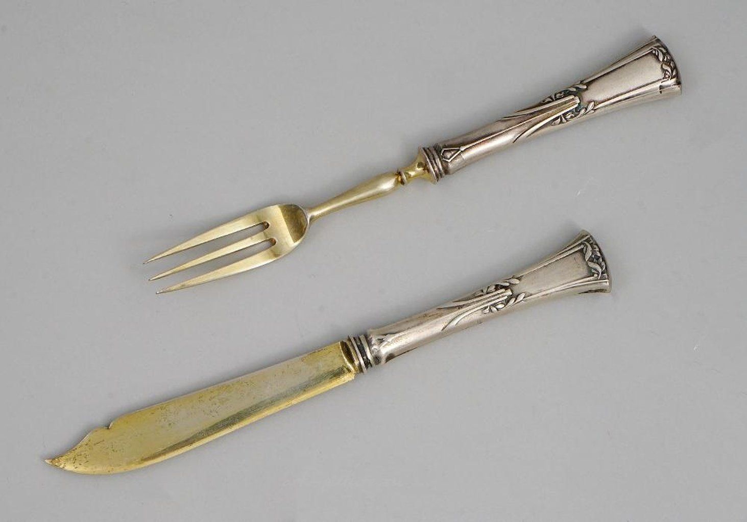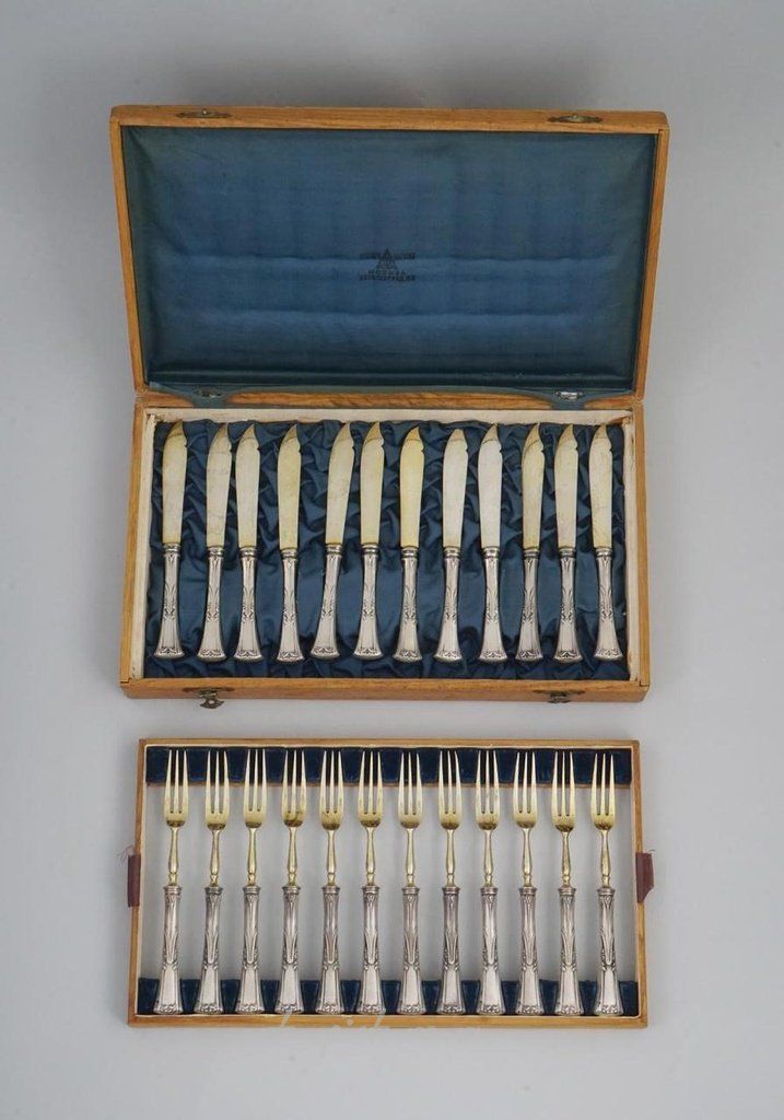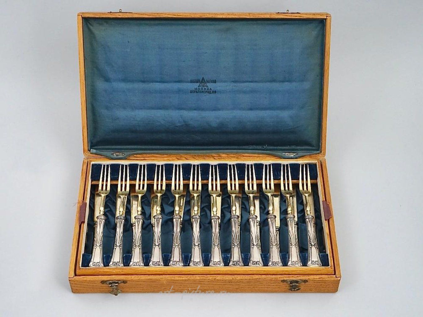 Иван Хлебников, Москва, 1899-1908 гг. Русский серебряный сервировочный набор с позолотой в оригинальном футляре. Всего 24 предмета, включая 12 фруктовых вилок и 12 ножей. Ручки украшены орнаментом в стиле Арт Нуво. Оригинальный деревянный футляр обит темно-синим шелком. Маркировка: серебро 84 пробы с маркой "кокошник", надпись "ХЛЕБНИКОВ" на кириллице, под императорским гарантийным знаком.
