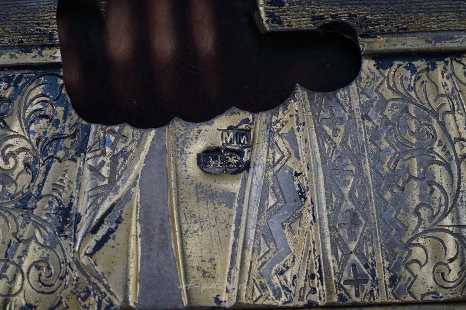 Москва, Алексей Маклаков, 1890 год. Русская православная икона Христа Вседержителя, украшенная серебряной ризой с позолотой, выполненной в технике чеканки и репуассе. Маркировка: 84 стандарт серебра, городская марка Москвы, марка мастера "АММ" для Алексея Маклакова.