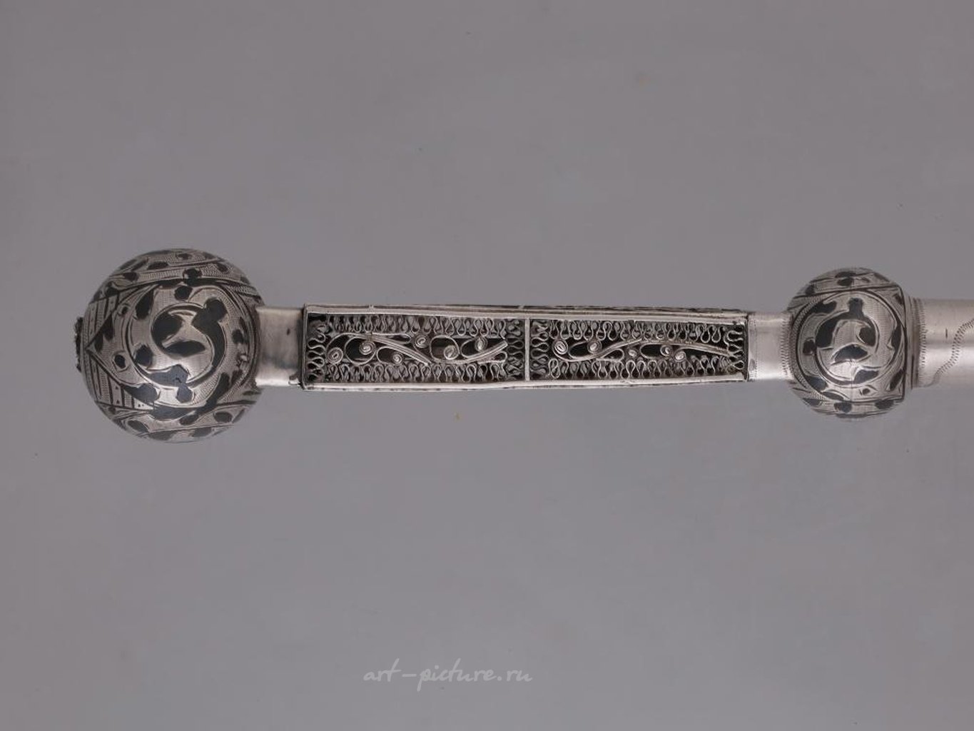Русская серебряная иудейская указательница Торы традиционной формы. Указательница украшена сложными ниелловыми и филигранными узорами. Маркировка: 84, полумесяц.