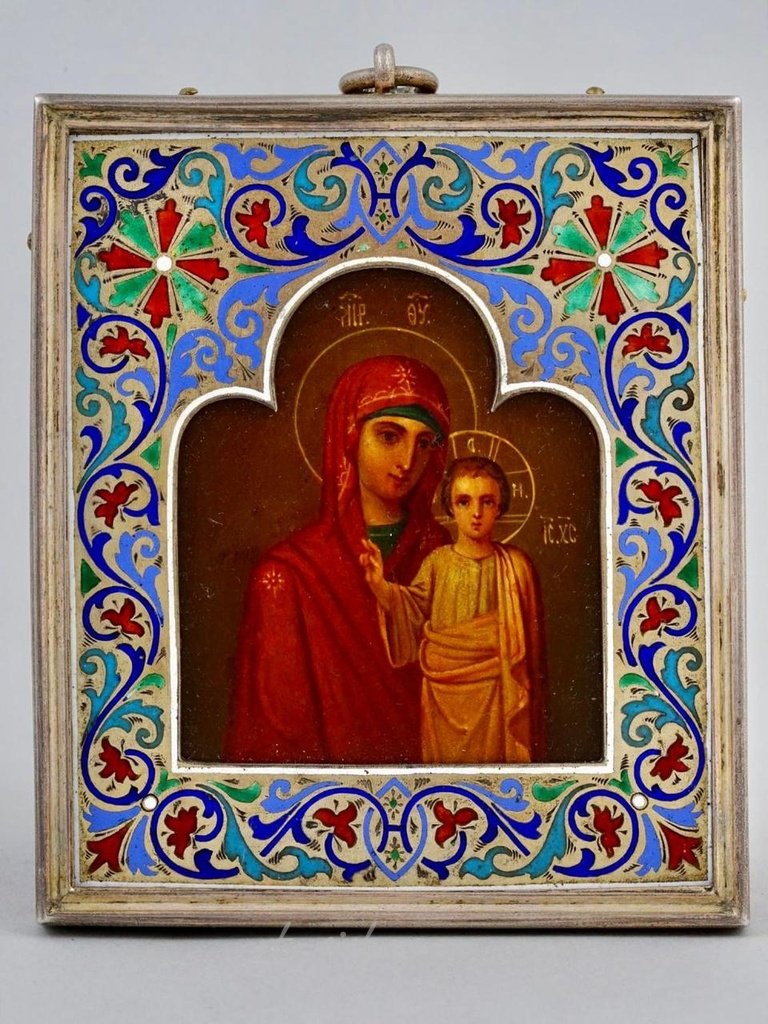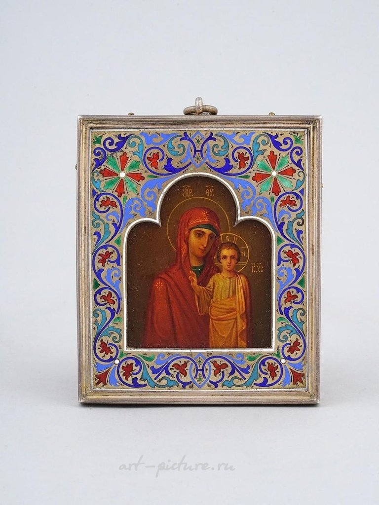 Русская православная икона, изображающая Богородицу Казанскую, выполненная маслом на цинковой панели. Размещена в серебряной окладе, покрытой золотом и украшенной полихромными эмалевыми узорами. Икона показывает Богородицу с наклоненной головой к Младенцу Христу, находящемуся слева от нее. Младенец Христос изображен фронтально, поднимая правую руку в благословение, а левая рука скрыта складками его химатии. Маркировка: 84 - стандарт серебра Императорской России.