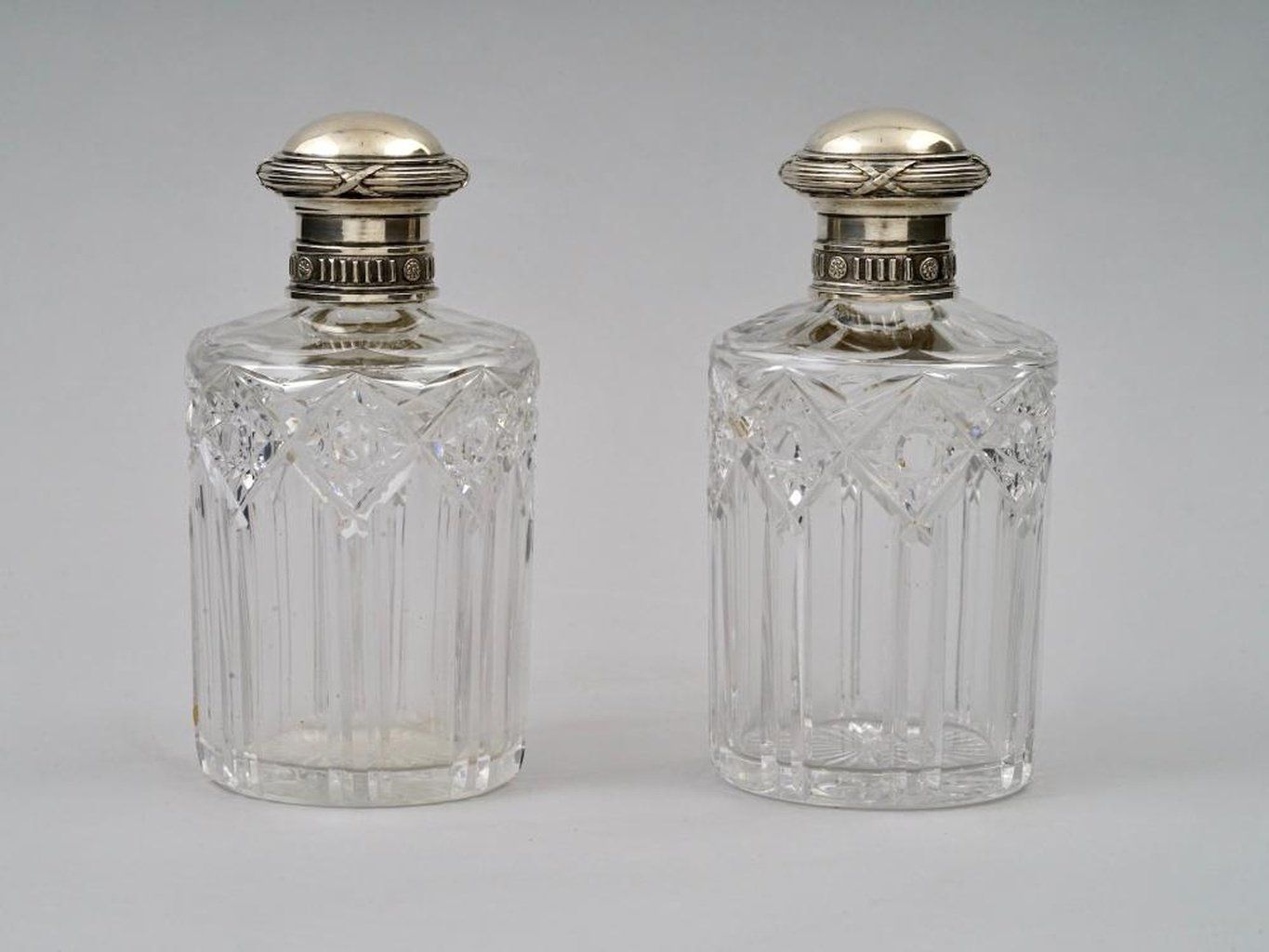 Фаберже, Москва, 1908-1917 годы. Пара русских красиво украшенных серебряных фляг, украшенных резным узором из стекла и с золочеными внутренними поверхностями. Маркировка: 84 стандарт серебра, К. ФАБЕРЖЕ, Москва.