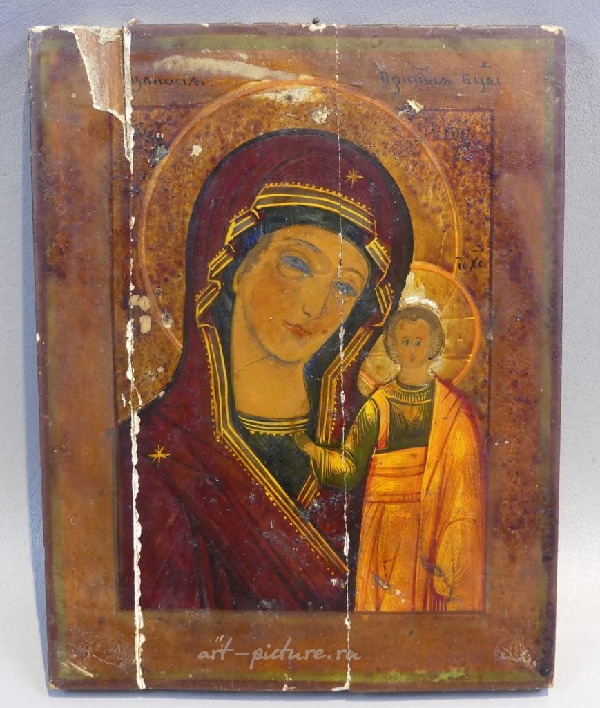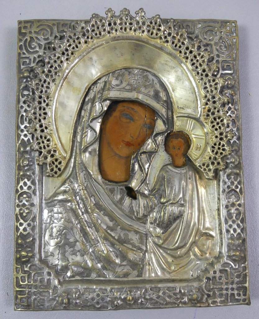 Антикварная русская или греческая ручная роспись на деревянной иконе Богоматери с Младенцем с серебряным наложением. Кажется, что есть подпись или идентификация. Плитка размером 8,5 x 6,5 дюймов, в раме 12,5 x 11 дюймов. Некоторые трещины на дереве.