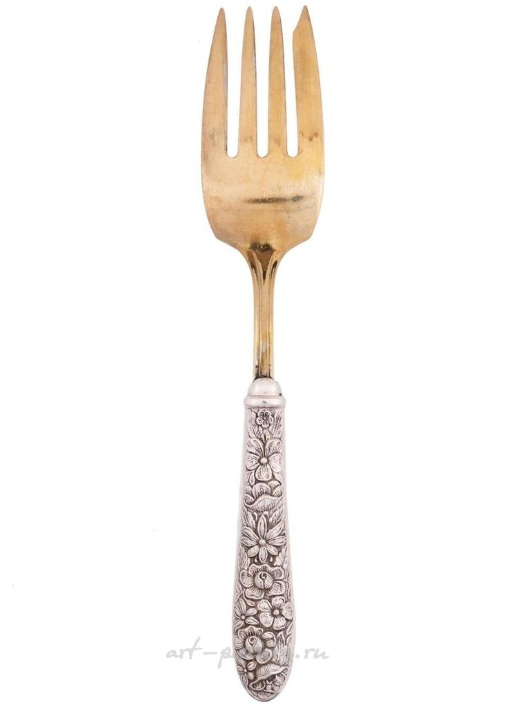Русская серебряная сервировочная вилка 84 пробы, частично покрытая золочением. Рукоять богато украшена тонким детализированным рельефным цветочным орнаментом. Шейка также имеет рельефный неоклассический мотив с завитками листвы, окружающими центральную розетку. Помечена маркой 84 пробы, маркой "кокошник" и другими русскими марками. Русская серебряная посуда, столовые приборы и столовые наборы, серебряные декоративные предметы для домашнего интерьера. Вес: 67 г.