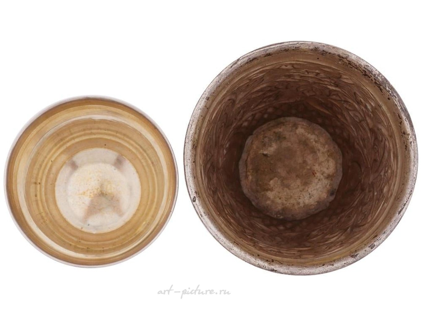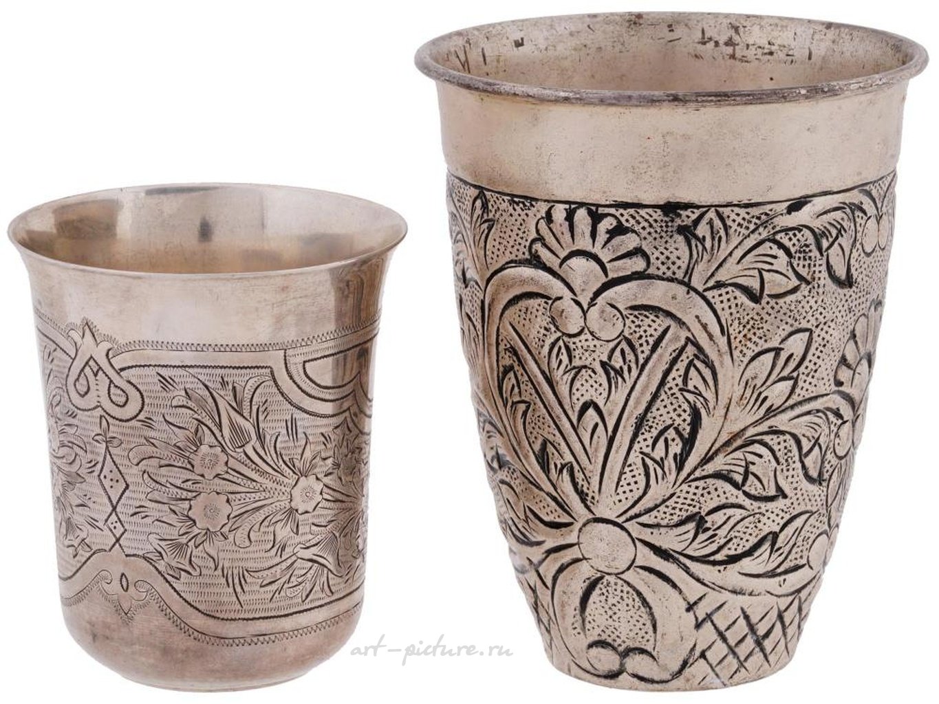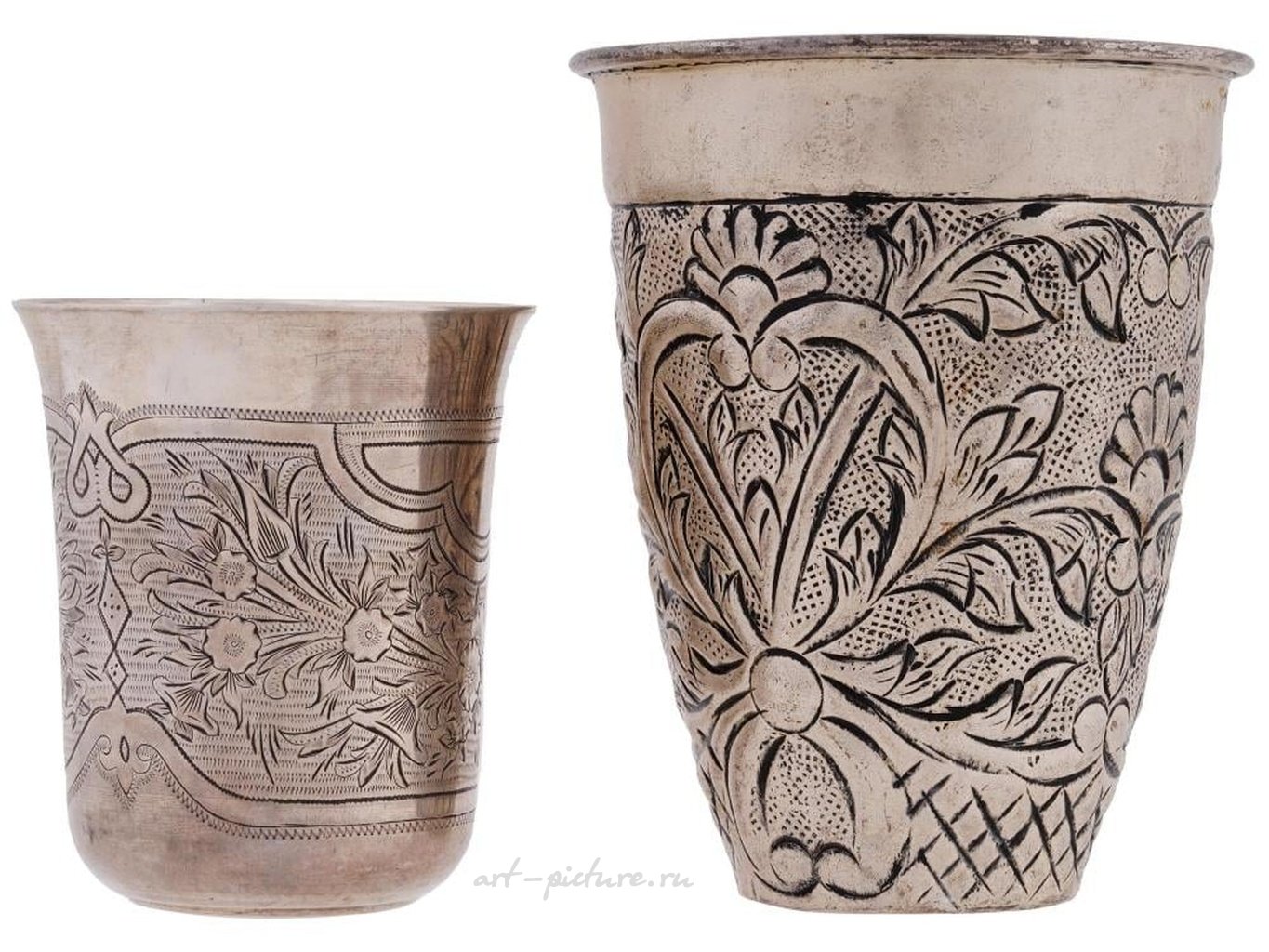 Два антикварных русских ручной работы серебряных кубка разных размеров с ниелловой отделкой на корпусах с флористическими и растительными мотивами. Золотая позолота внутри. Помечены на основании производителем и 84 русскими пробирными клеймами. Период: начало XX века. Общий вес: 209 г. Антикварные русские серебряные кубки и посуда для напитков.