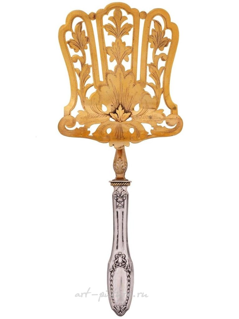Качественная серебряная сервировочная лопаточная ложка русского производства с позолоченными и гравированными украшениями на проколотой части и резными узорами на рукоятке. Помечена маркой производителя и 88 русской серебряной пробы. Русская серебряная посуда, столовые приборы и столовые приборы, серебряные декоративные предметы коллекционирования для домашнего интерьера. Вес: 148 г.