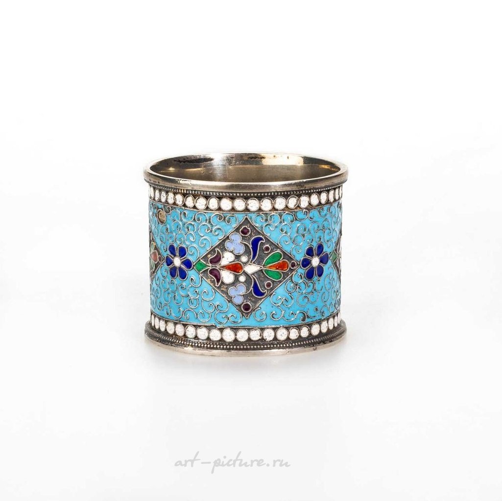 Эмаль Клузоне. Первая марка Кокошник, украшенная свитками и цветочными головками, с выделенной синей, белой, зеленой, оранжевой и фиолетовой эмалью. Диаметр 4,2 см, вес 1,3 тройских унции. Один нечеткий штамп внутри синего узора.