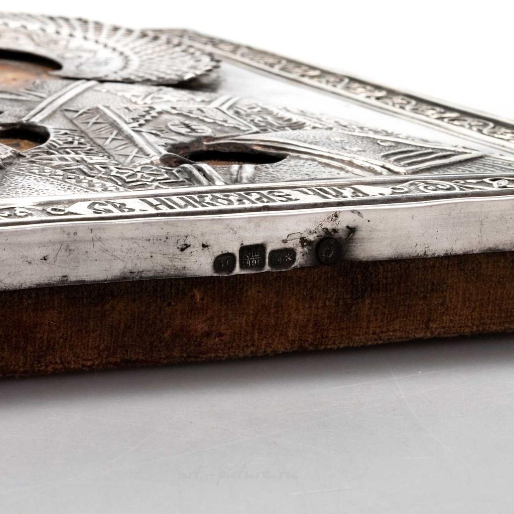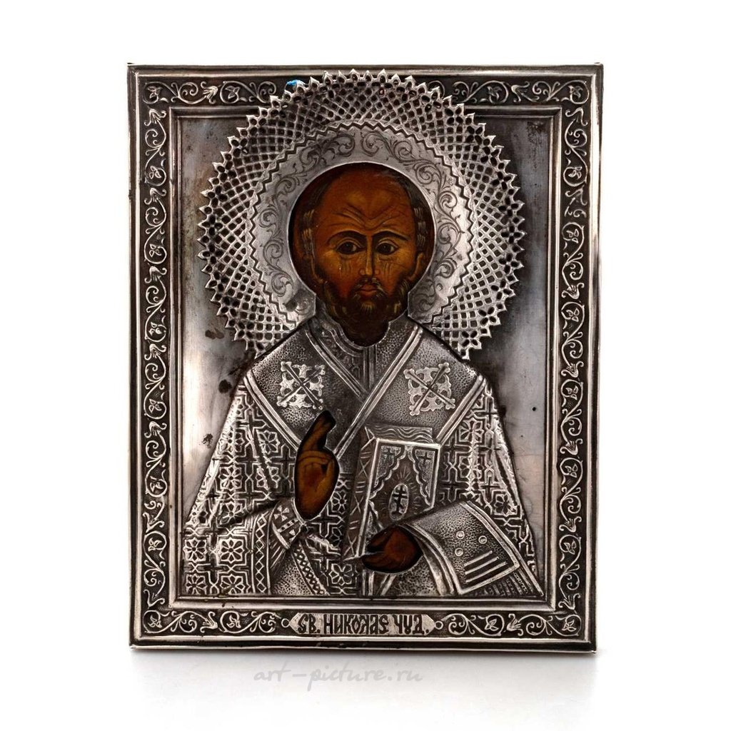 Поздний 19-й век СЕРЕБРЯНАЯ ИКОНА с монтажем от Александра Тимофеевича Шевякова, 1890 год, Санкт-Петербург, стандарт 84, прямоугольная рама с открытым узором, вставленная с лицом и руками, выпуклыми одеждами и книгой, внутри листового бордюра, с кириллическим текстом. 22см на 17,5см, в целом хорошее состояние, трещины в краске, износ и повреждения, соответствующие возрасту.