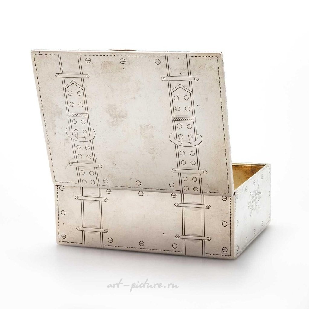 Русская серебряная шкатулка с маркой производителя И. И. Футикина на кириллице, маркой ассея А. А. Смирнова, 1893 год, Москва, прямоугольная форма, гравировка на крышке и боках, имитирующая путешественный сундук. Ширина 10,6 см, вес 7,0 тройских унций. Незначительные следы старения на поверхности, но в целом в очень хорошем состоянии.