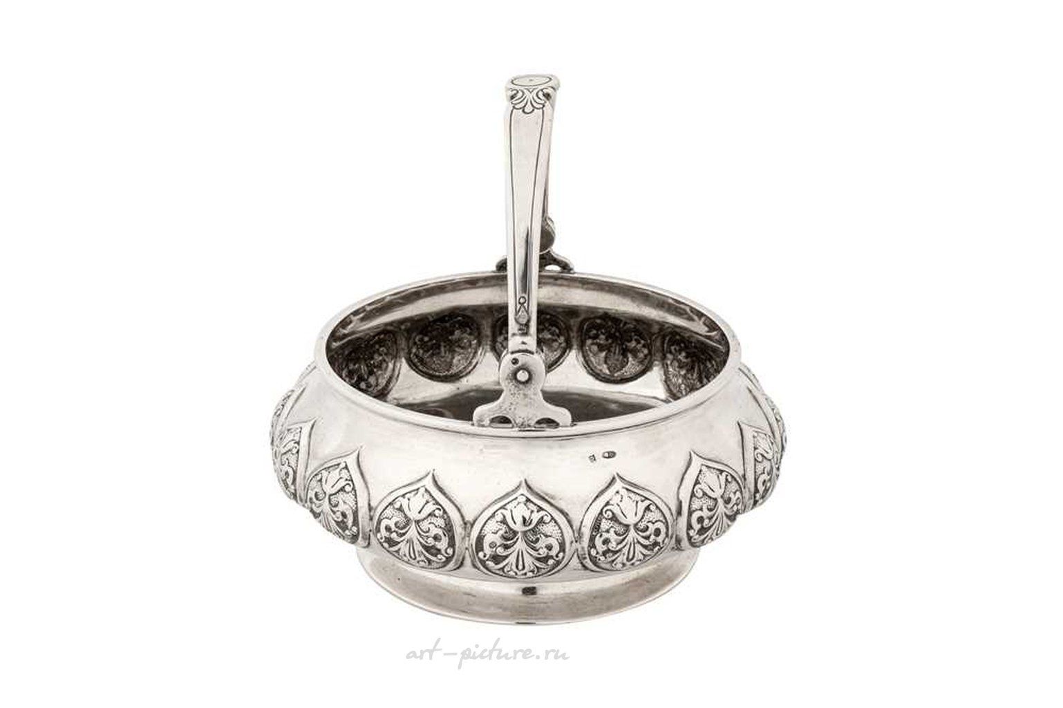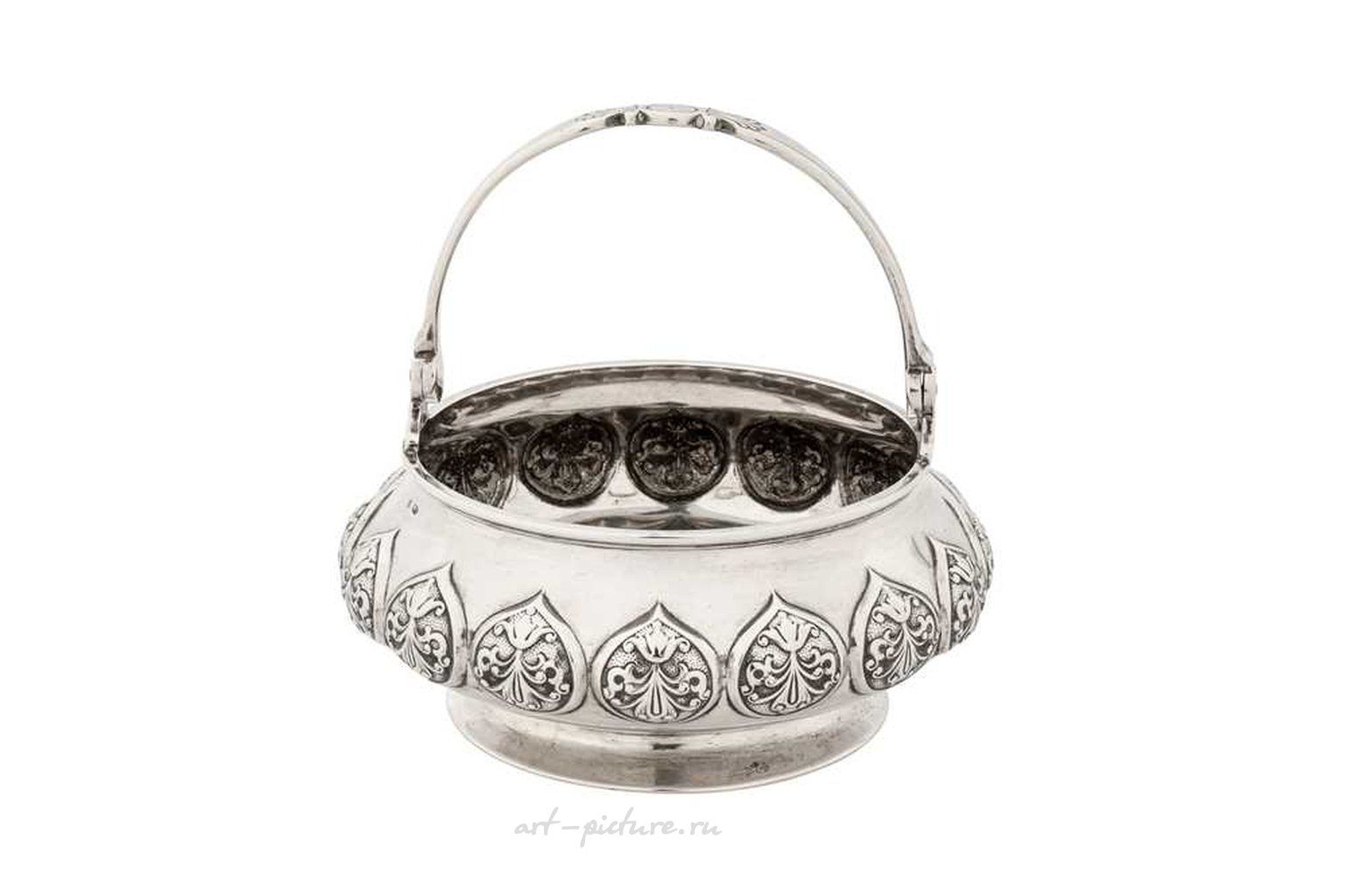 Москва после 1908 года, мастерская ПЛ. Корзинка имеет сжатую круглую форму на расширяющейся круглой ножке, ручка-качели с чеканкой. Корпус украшен выпуклым рисунком в виде лепестков, чеканкой фолиевых форм на фоне текстурной поверхности. Диаметр - 14 см / 5,5 дюймов. Вес - 409 грамм / 13,15 тройских унций.