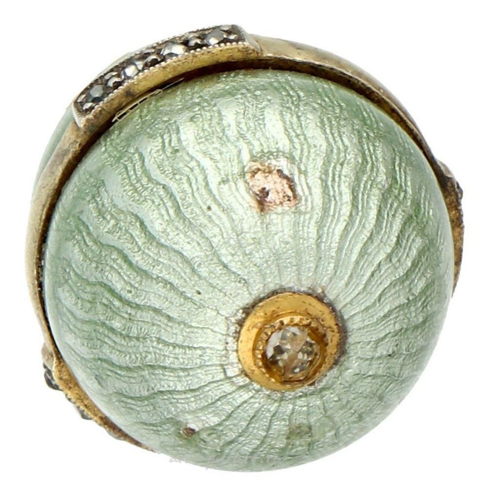 Светло-зеленое эмалевое яйцо с золотой полосой по всему периметру, украшенное 12 розово-резными бриллиантами в миллегриффе и одним бриллиантом внизу. В хорошем состоянии. Маркировка: голландская марка 585, русская марка 585, 925, мастерская марка и подпись Ананов. Длина: 2 см. Вес: 4,68 грамма.