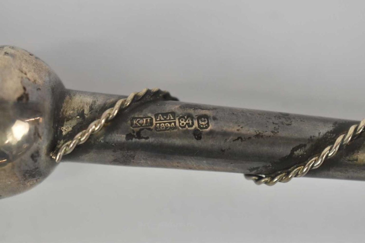 ЮДАИКА: поздний 19-й век, русское серебро 84-го пробы, яд или указатель Торы с львиным наконечником и филигранной отделкой, палец украшен цветным камнем, 1894 год, длина 28,5 см, примерно 3 унции/95 г.
