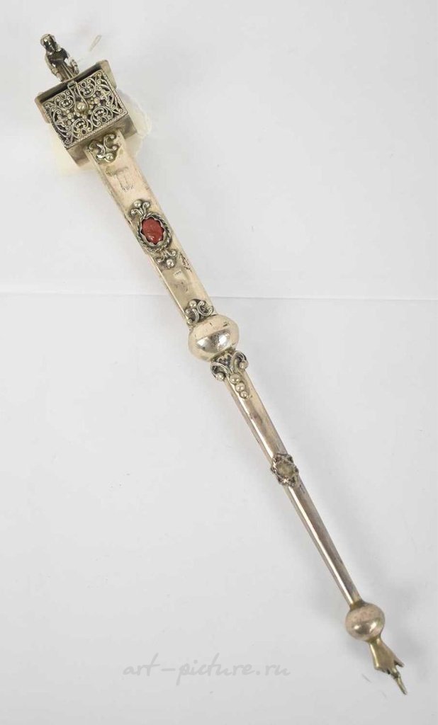 ЮДАИКА; поздний 19-й век русско-польская серебряная яд или указатель Торы, верх с шарнирной спайс-коробкой с изображением Моисея, клеймо Йозефа Соснковского, длина 34 см, примерно 2,9 унций / 91 г. Состояние: отсутствует драгоценность с пальца.