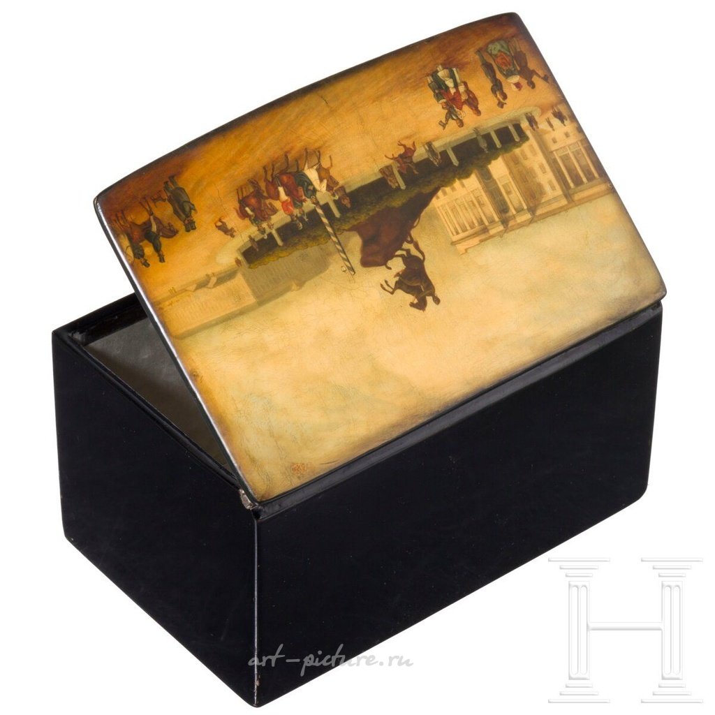 Папье-маше, черная лакировка, внутри обита серебряной фольгой. Шарнирная крышка с полихромной темперной живописью: вид медного всадника на Сенатской площади в Санкт-Петербурге (конная статуя царя Петра Великого). Внутри крышки размещены выставочные медали. Есть незначительные пропущенные части. Размеры 9,5 x 17,5 x 11,5 см. См. книгу "Русские лаковые папье-маше коробки: 200 лет ручной миниатюрной живописи".