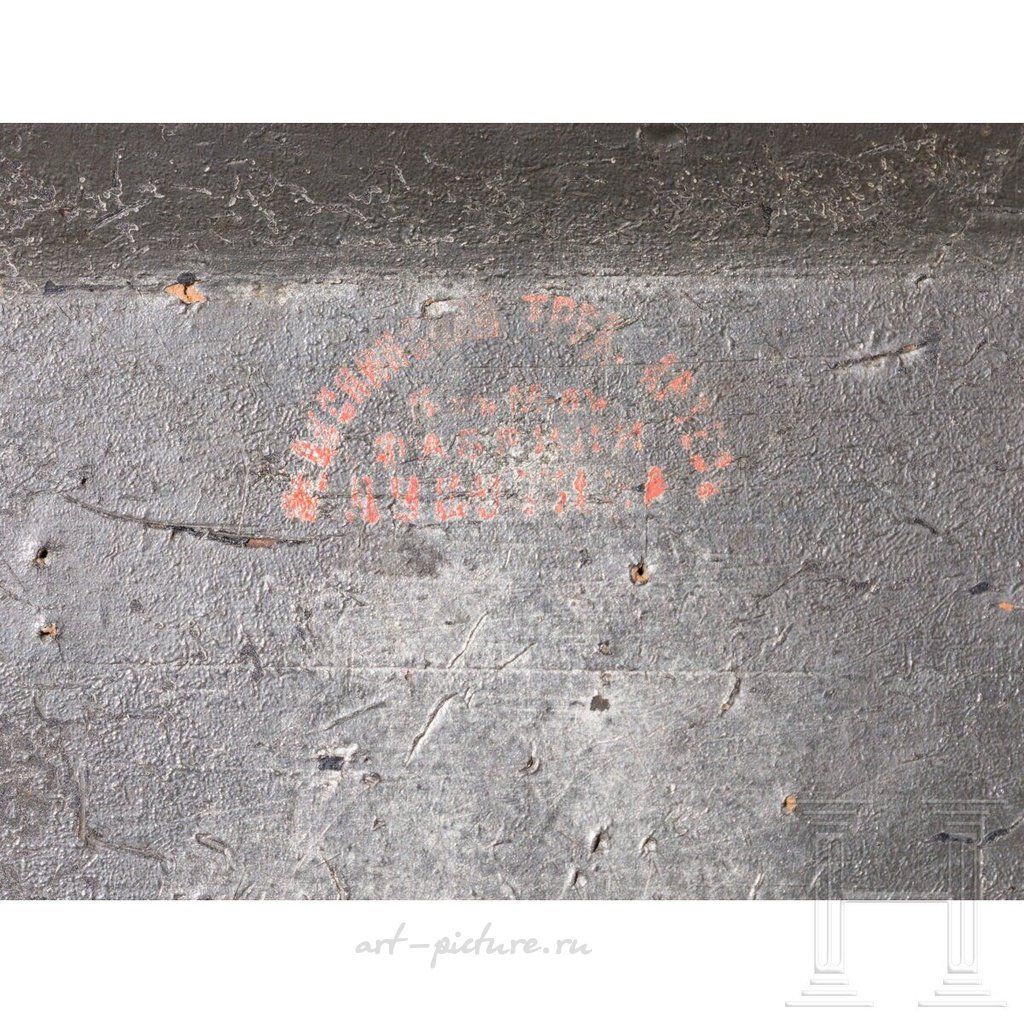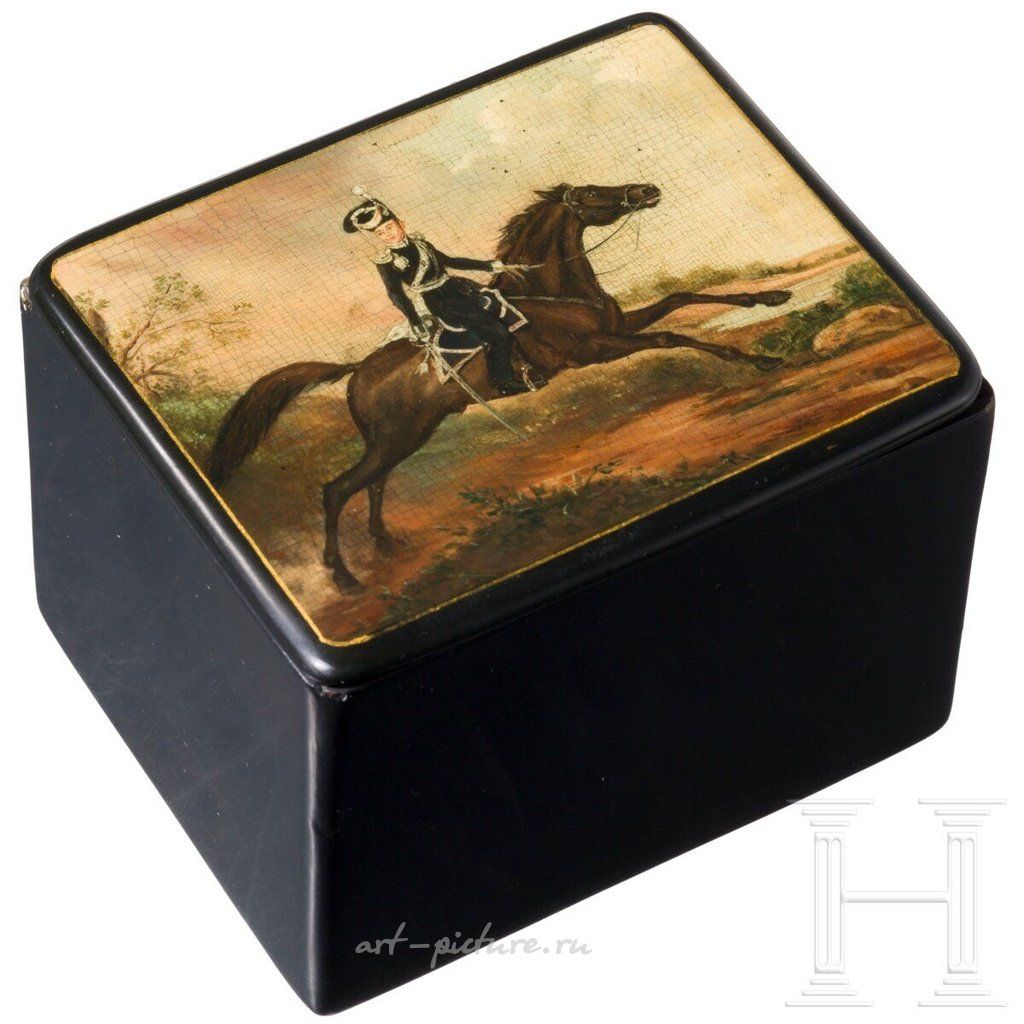 Папье-маше, черная лаковая отделка, серебряная фольга внутри. На шарнирной крышке полихромная живопись: гусар на коне. На крышке отметка с кириллической надписью "Федоскинская Труд. Артель. Фабрики Лукутина" (Федоскинская трудовая артель бывших работников фабрики Лукутина). Серебряная фольга с отсутствующими частями. Кракелюр. Размеры 6,7 х 9,5 х 8 см. Сравнить.