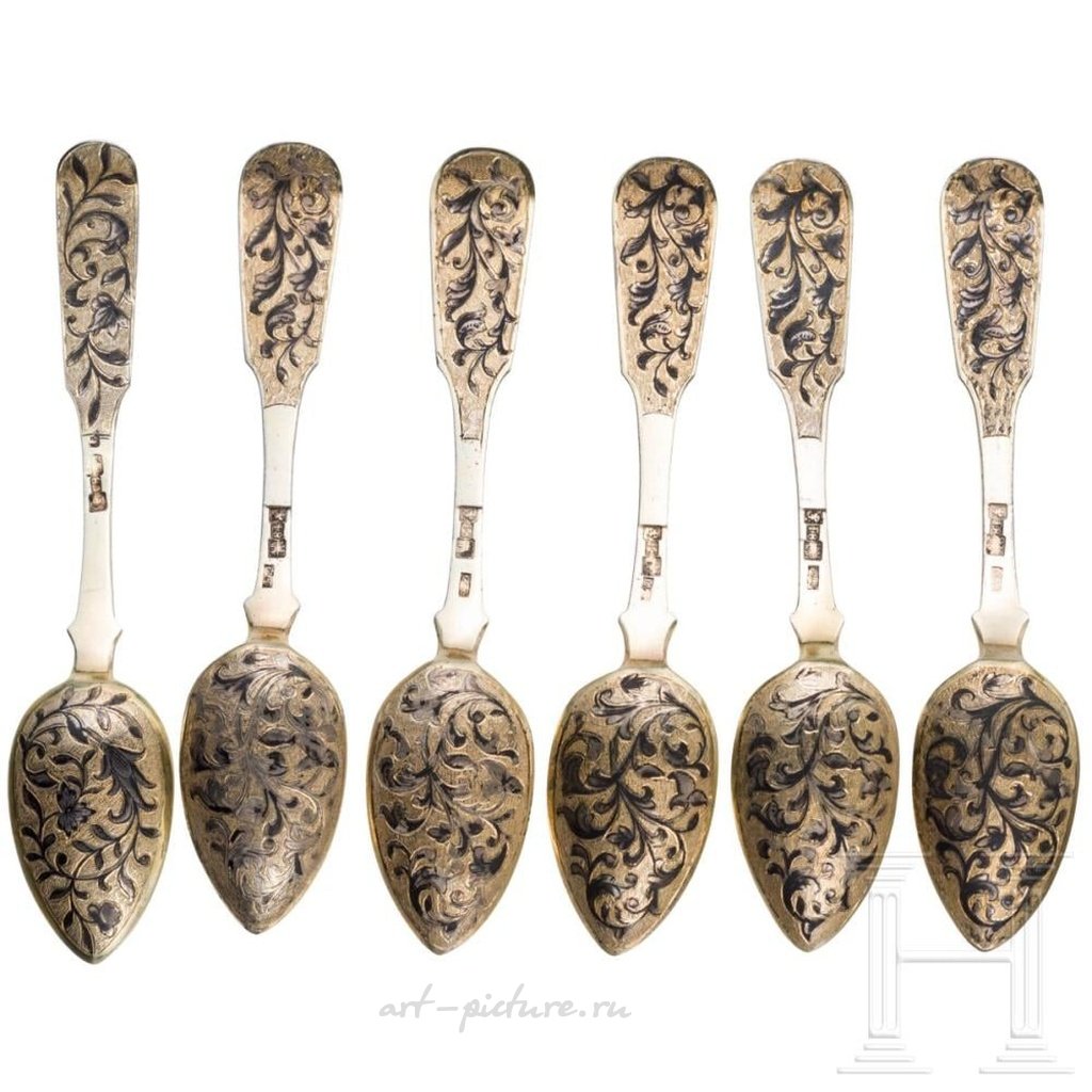 Тонко ниеллоированный листья на пробитом фоне с обеих сторон. Помечено городским клеймом, пробой "84", пробирным клеймом Андрея Антоновича Ковальского "АК 1847" и неопознанным клеймом производителя "АК". В комплекте с футляром. Длина каждого 13,5 см, вес 140 г. Состояние: II.