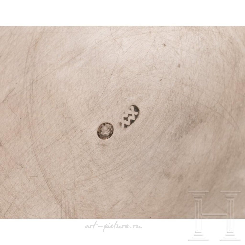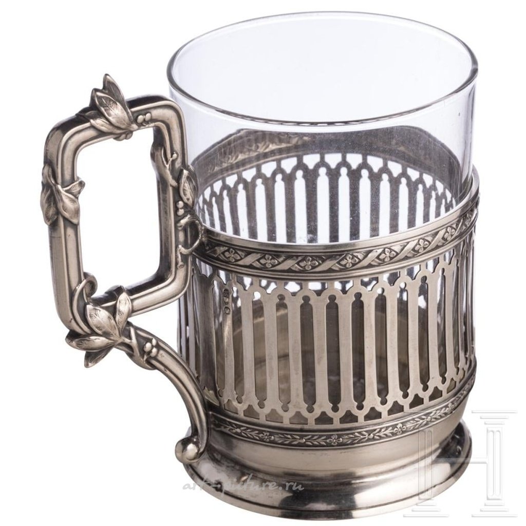 Цилиндрическое, тщательно изготовленное тело с рельефным цветочным узором. Угловая ручка с лепным листовым орнаментом. Помечено маркой осмотра и маркой производителя. В комплекте стекло. Габариты 11 x 11 x 7 см, вес: 93,96 г (держатель для чайного стакана). Состояние: II.
