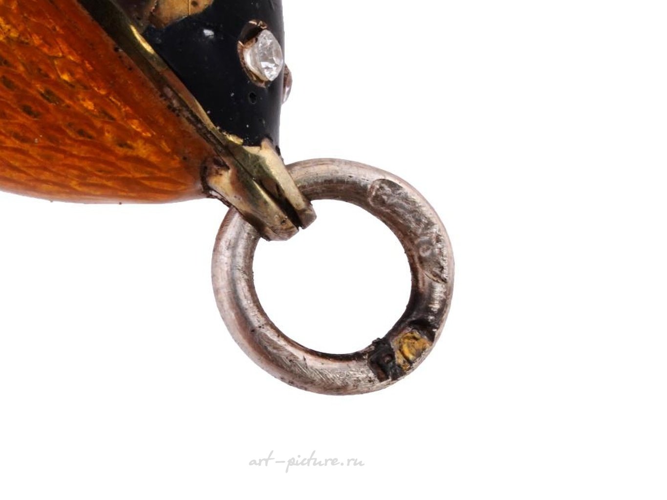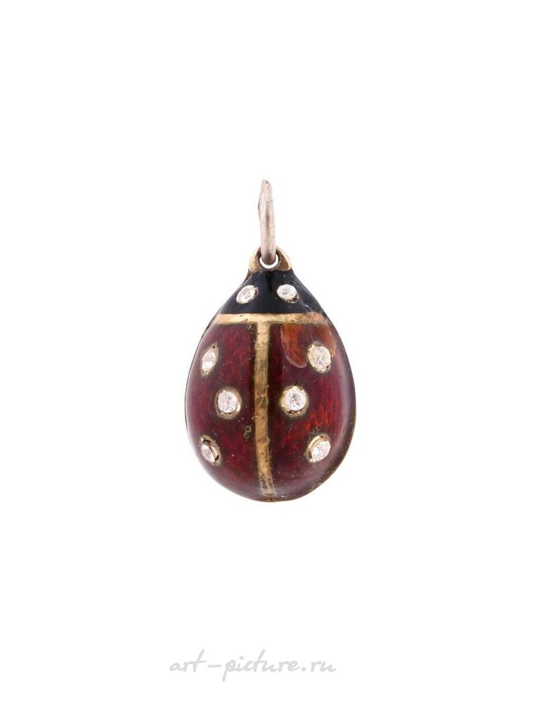 Русская подвеска в форме пасхального яйца, покрытая золотом и эмалью. Внешняя сторона яйца выполнена в виде божьей коровки, покрытой гильоше эмалью в оттенках бургундского, черного и желтого цветов, украшенная восьмью бриллиантами. Маркировка на кольце неразборчива. Ручная работа, изысканное ювелирное изделие, русское украшение для коллекционеров, подарки и аксессуары для женщин. Общий вес: 5 грамм.