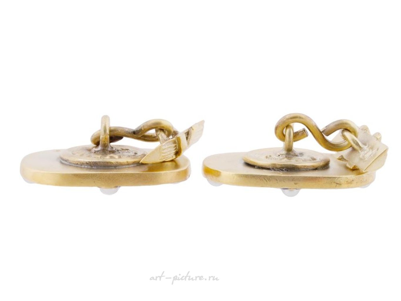Пара русских мужских запонок из позолоченного серебра с ручной гравировкой изображений императора Николая II и императрицы Александры. Каждая из них украшена голубой эмалью с четырьмя жемчужинами. Соединены цепочками с терминалами. Помечены клеймом 84 русского серебра и клеймами производителя. Общий вес: 18 г. Русские серебряные аксессуары и ювелирные изделия для мужчин.