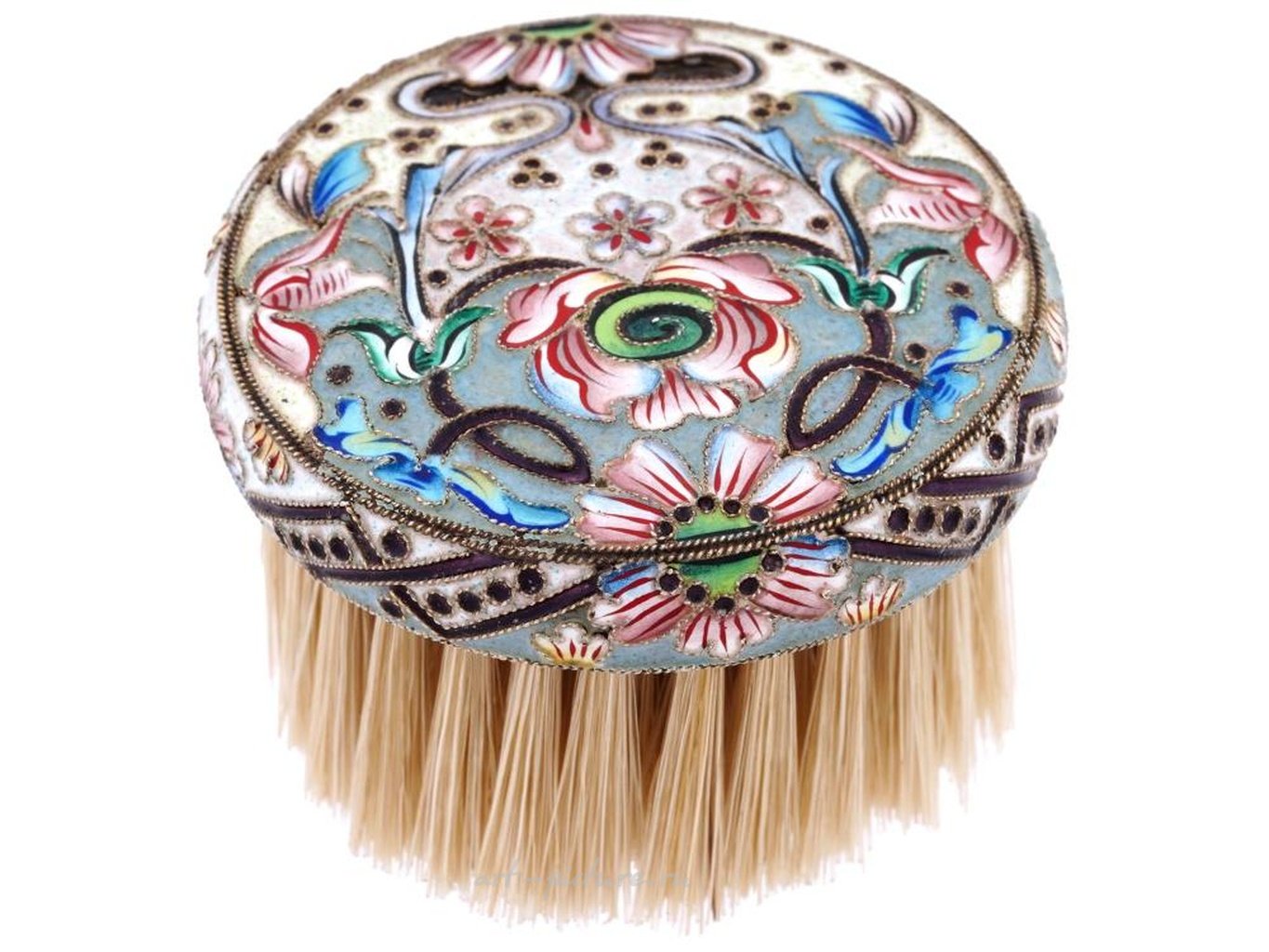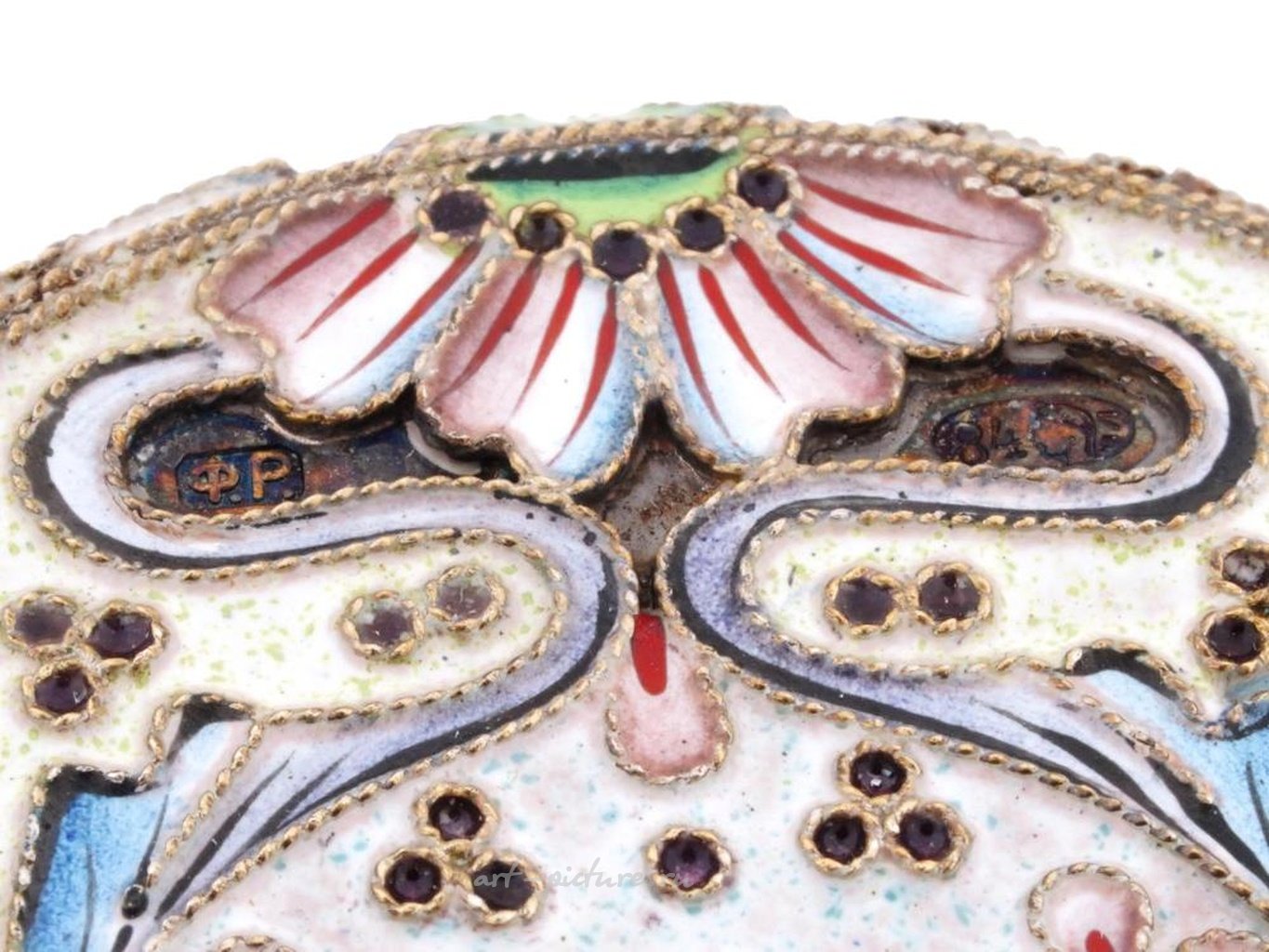 Изделие украшено теневой эмалью в технике клузоне. Маркировка 84 пробы и марка изготовителя находятся на верхней части. Общий вес: 30 грамм. Коллекционные ювелирные изделия и сервировка из серебра, декор, аксессуары для снукера, покера и бильярдного стола.