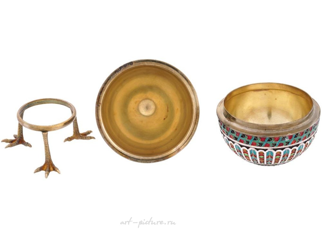 Русская серебряная яичница с позолоченной крышкой. Изделие красиво украшено орнаментальной эмалью клузонне в красном и зеленом цветах. Яичница сопровождается позолоченной подставкой в виде ножки курицы. На ободах обоих предметов присутствуют клейма 84 пробы серебра и марка изготовителя. Общий вес: 171 грамм. Коллекционные русские изделия из серебра, ювелирные украшения и декор.