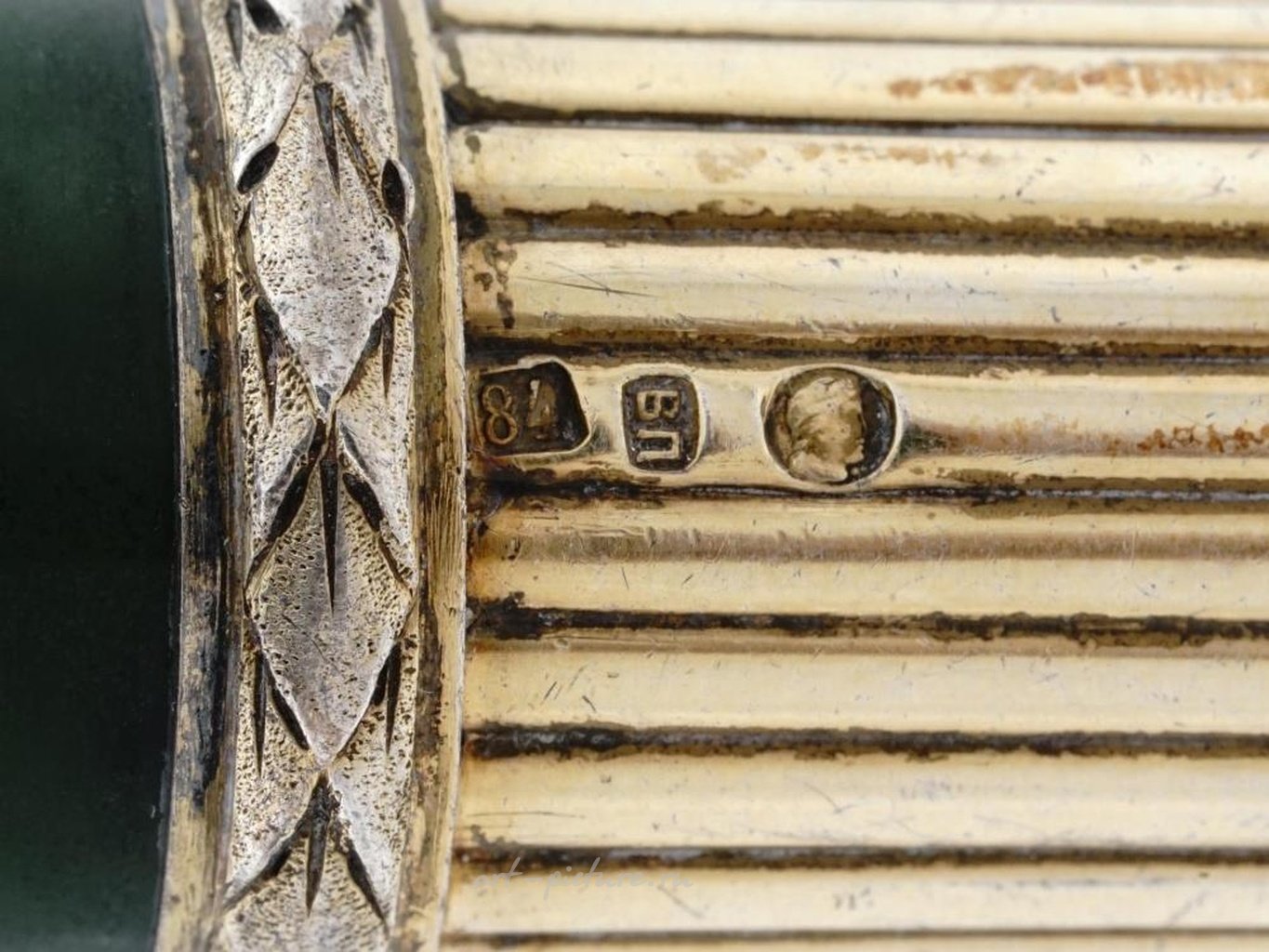 Элегантная резная русская рукоятка для зонта из нефрита, установленная в позолоченную серебряную основу с ручной гравировкой полос на корпусе и украшением в виде лаврового венка на краях. Отмечена клеймами: 84 русский императорский серебряный стандарт, клеймо "кокошник" и марка на кириллице: ВП. Русские резные рукоятки для тростей и зонтиков и коллекционные изделия из серебра. Вес 71 грамм.
