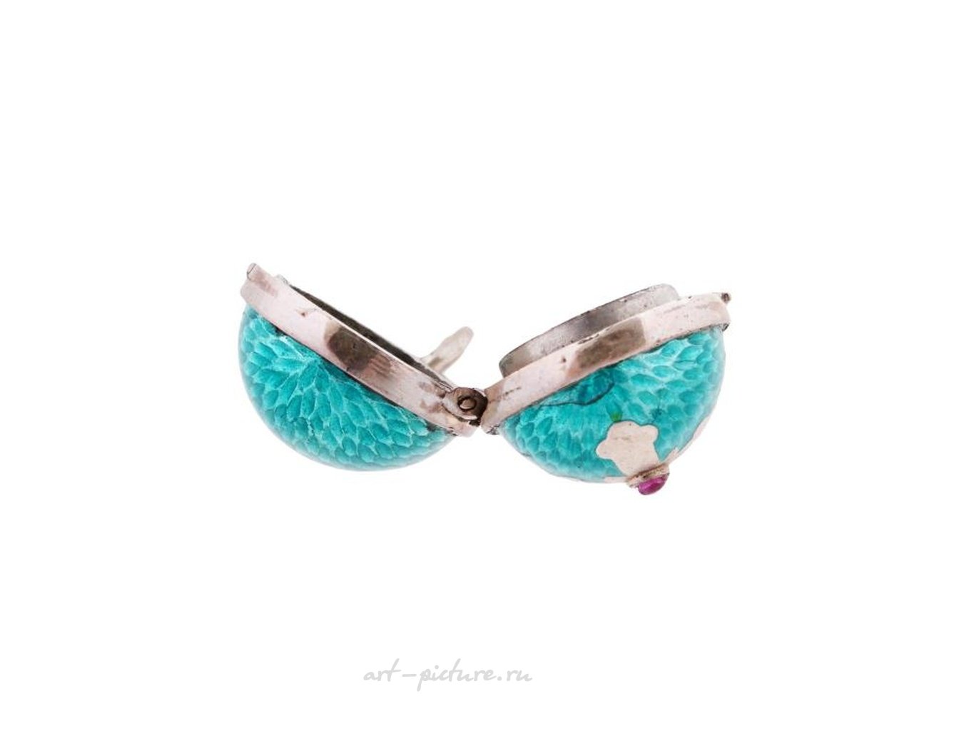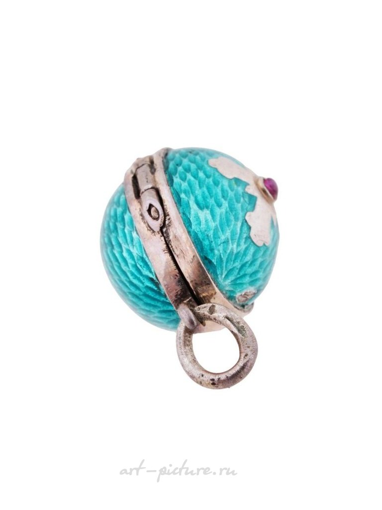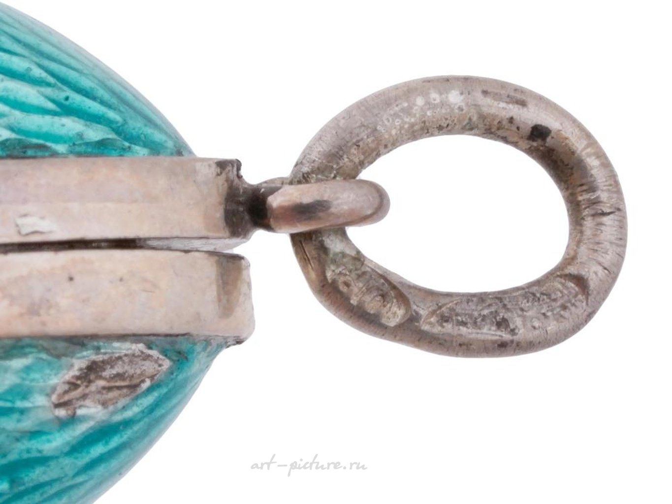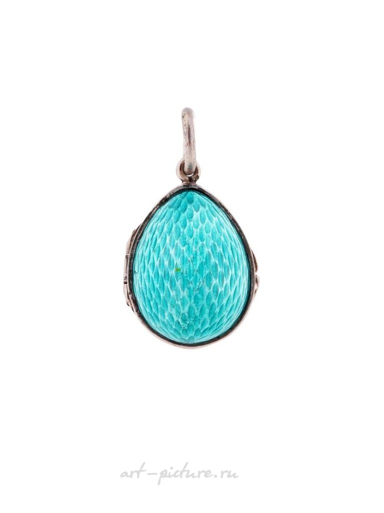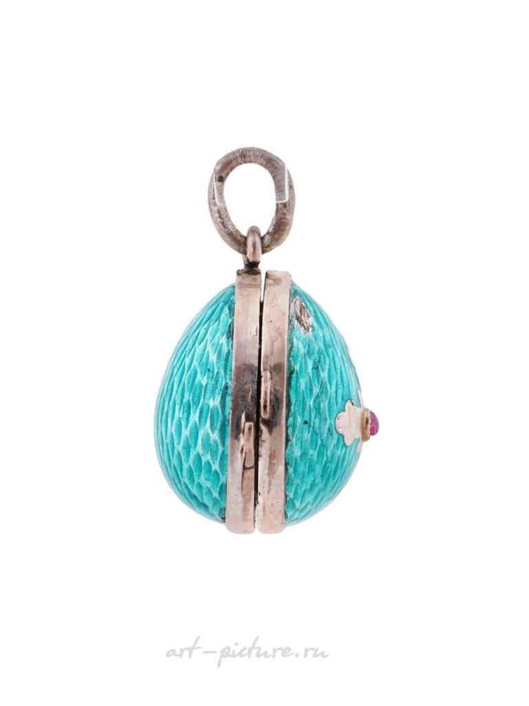 Русский серебряный и гильошированный эмалью миниатюрный подвесной замочек в форме яйца, разделенный на две закрепленные половины. Поверхность покрыта яркой бирюзовой эмалью и украшена крестом на лицевой стороне и красным камнем-кабошоном в центре. Отмечен клеймом с 88 российским имперским серебряным стандартом и маркой производителя: ОП. Ручная работа, изысканное ювелирное изделие, русское украшение для коллекционеров, подарки и аксессуары для женщин. Общий вес: 4 г.