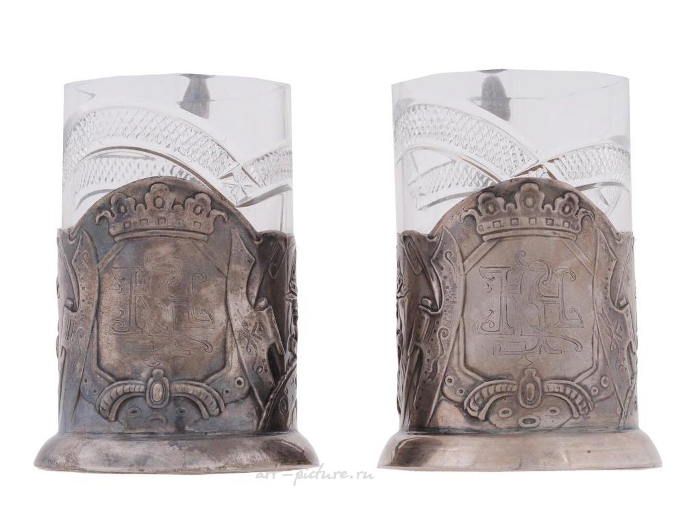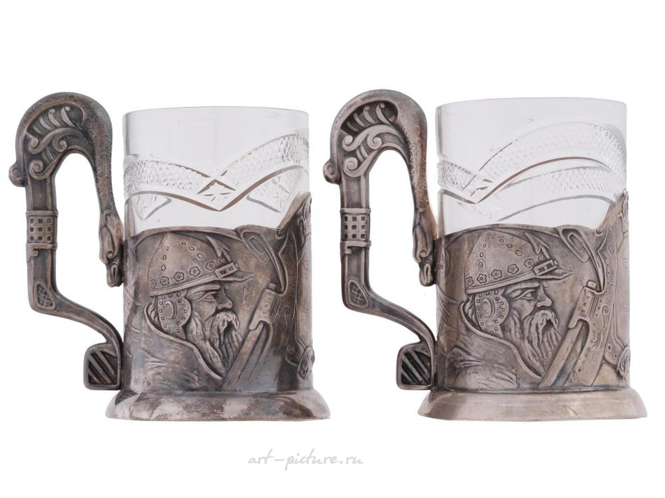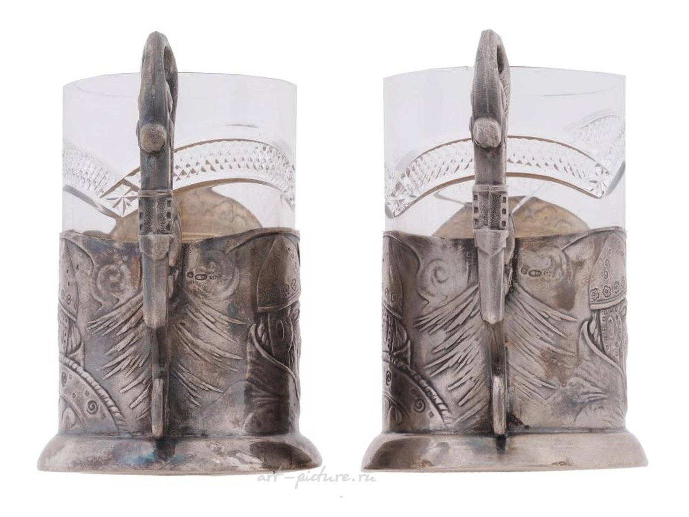 Подстаканники украшены выпуклыми изображениями богатырей и гравированными стилизованными инициалами КН. Маркировка серебра стандарта 84 и марка изготовителя находятся на боковой стороне обоих подстаканников. Общий вес: 289 грамм. Подстаканник - это русский держатель для стакана, обычно используемый для горячего чая. Коллекционная русская серебряная посуда и столовые приборы.
