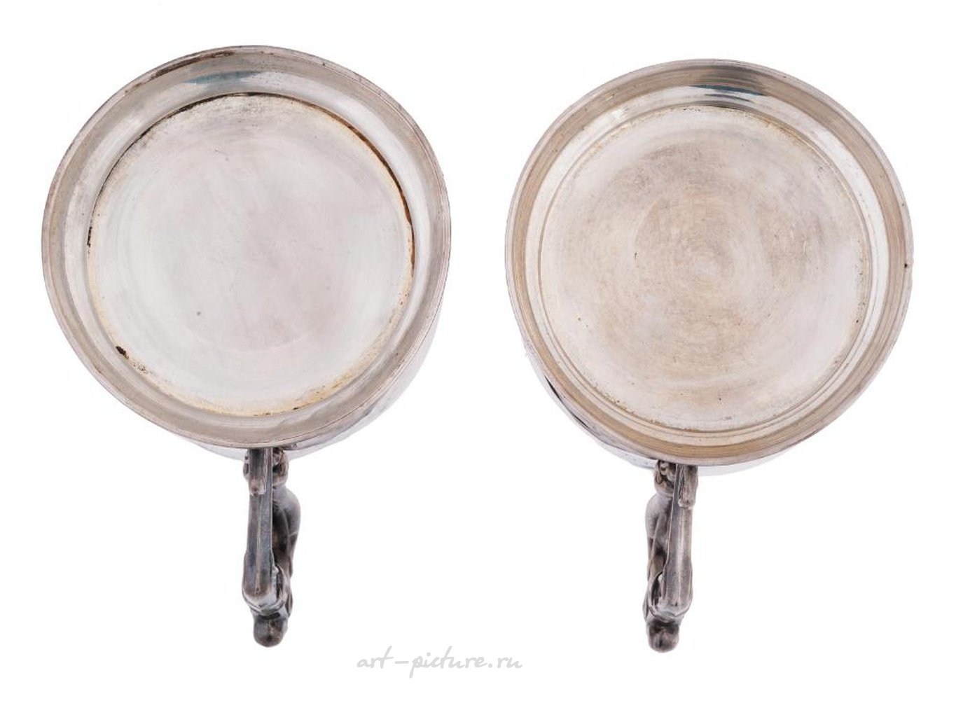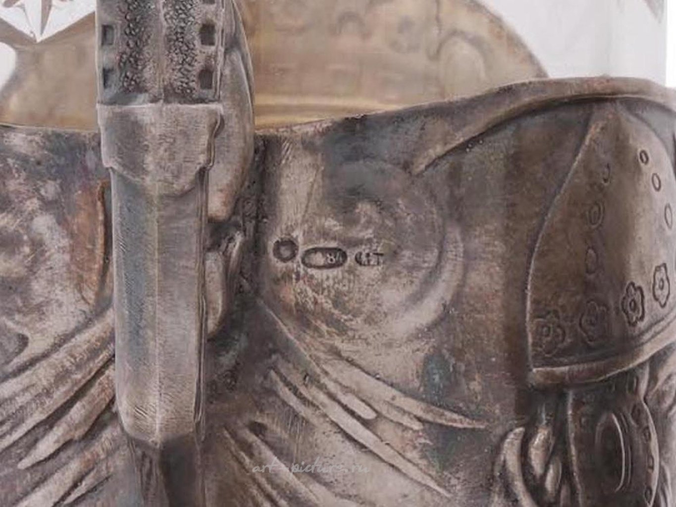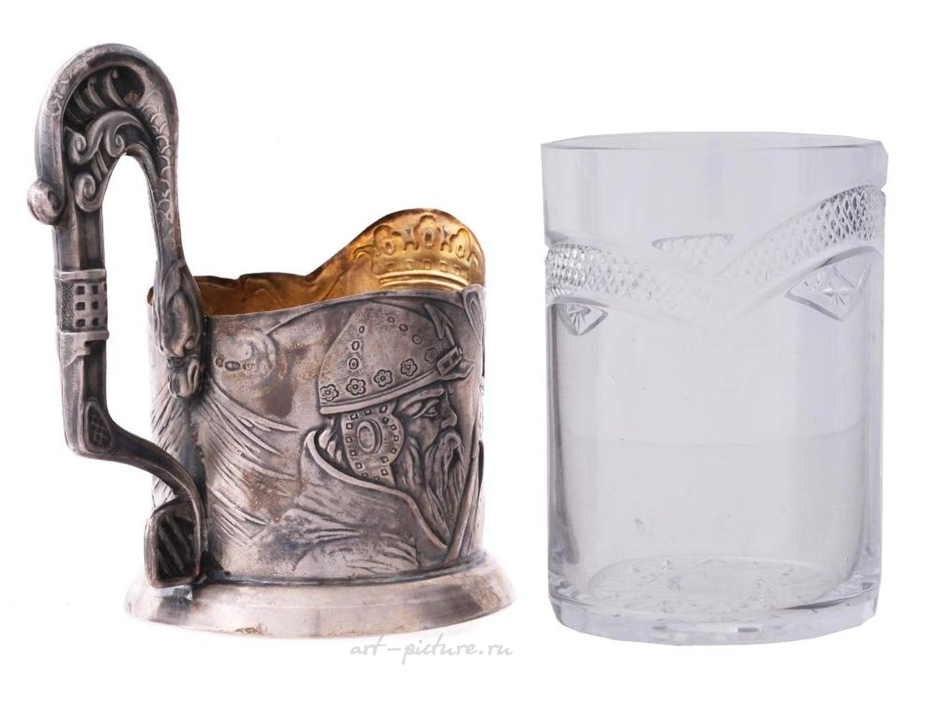 Подстаканники украшены выпуклыми изображениями богатырей и гравированными стилизованными инициалами КН. Маркировка серебра стандарта 84 и марка изготовителя находятся на боковой стороне обоих подстаканников. Общий вес: 289 грамм. Подстаканник - это русский держатель для стакана, обычно используемый для горячего чая. Коллекционная русская серебряная посуда и столовые приборы.