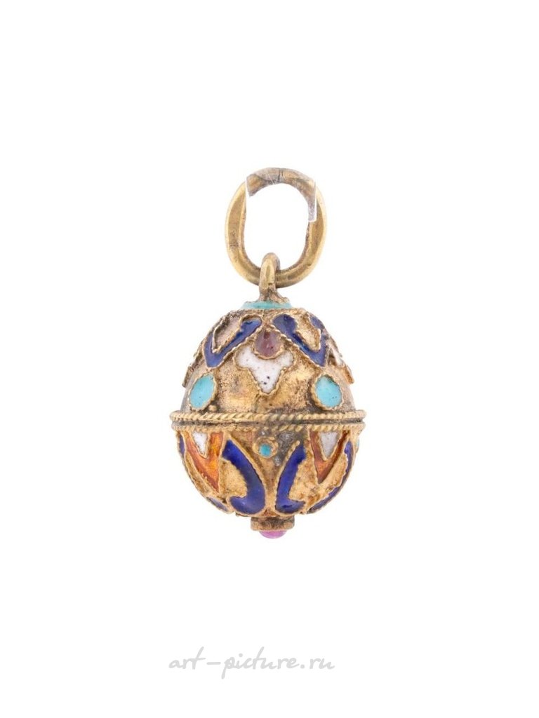 Русская подвеска в форме пасхального яйца из серебра 88 пробы с позолотой и эмалью. Внешняя сторона украшена растительными узорами и листьями в синем, бирюзовом, оранжевом и белом цветах, выполненными в технике клоизонне. На дне подвески украшение из аметиста. Помечена клеймом 88 русского имперского серебра и мастерской: ОП. Ручная работа, изысканное ювелирное изделие, русское украшение для коллекционеров, подарки и аксессуары для женщин. Общий вес: 5 грамм.