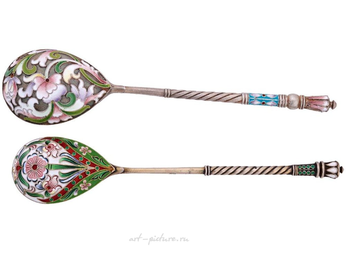 Пара русских серебряных чайных ложек с флористическим рисунком в технике шейдированной эмали клузонне. Одна ложка позолоченная. Маркировка стандарта серебра 84 проба и марка изготовителя находятся на боковой стороне обеих изделий. Общий вес: 56 грамм. Коллекционные русские серебряные приборы, посуда и столовые приборы, столовые принадлежности, чайный сервиз.